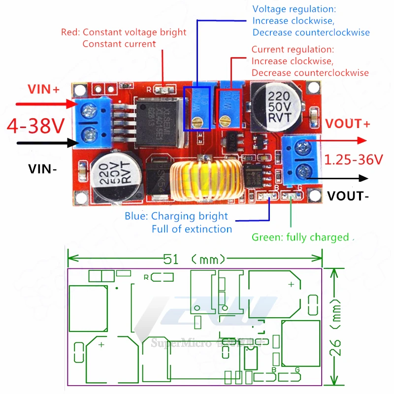 Ce module est un module abaisseur ajustable. Vous pouvez modifier la tension de sortie en ajustant la résistance réglable bleue sur le module. La différence de tension d’entrée et de sortie est de 1V, et la tension minimum peut être de 0,8V.