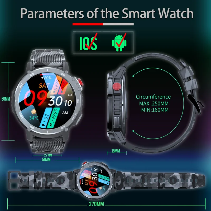- Spécifications de la montre intelligente: diamètre 51mm * épaisseur 15mm;