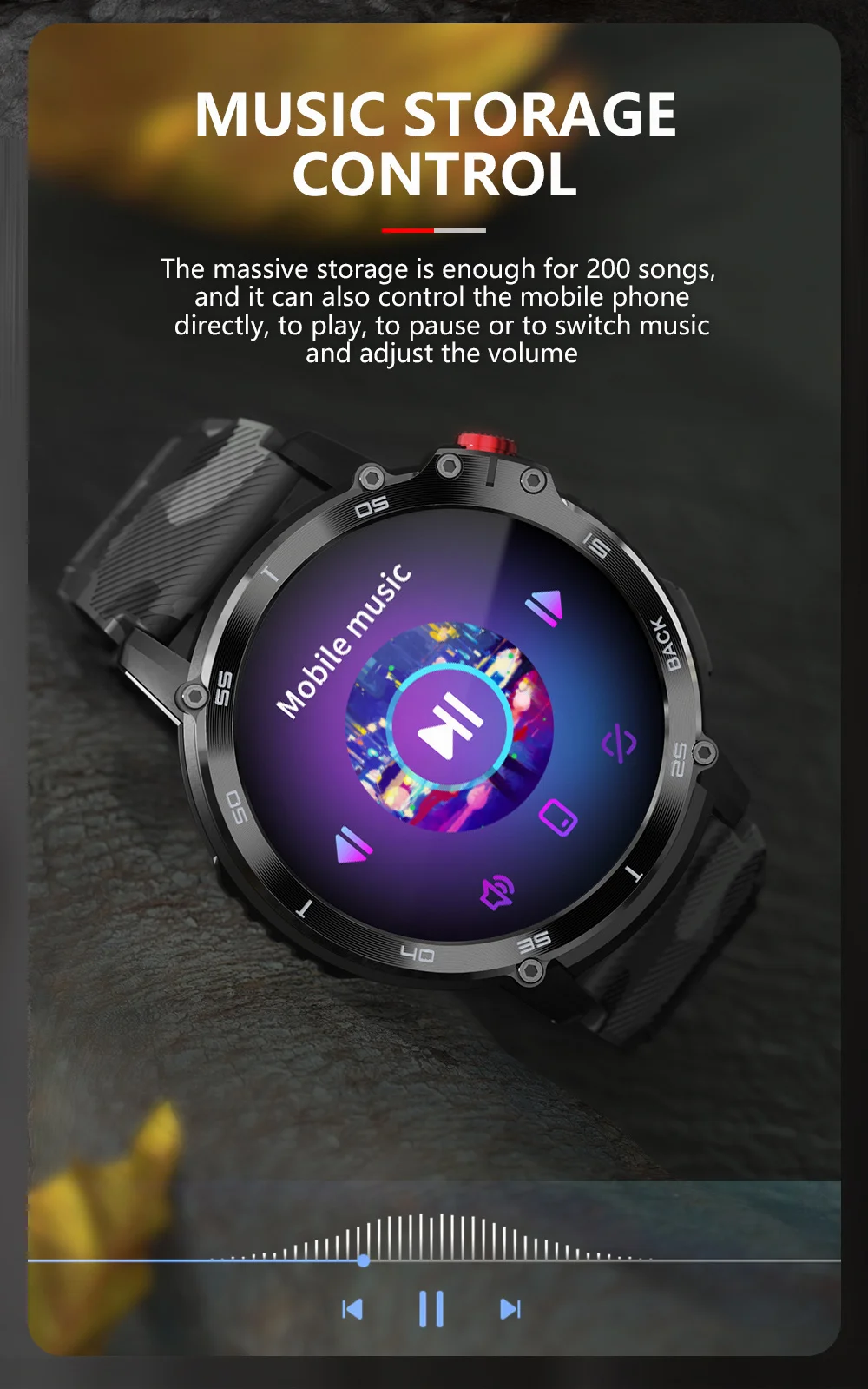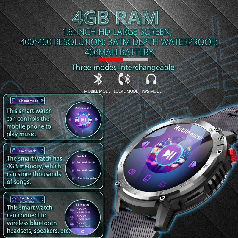 - Fonction de musique de la montre intelligente: 1. Jouez de la musique sur la montre intelligente (la montre est livrée avec une mémoire de 4 Go, qui peut stocker des milliers de chansons) 2. Contrôlez le téléphone pour lire de la musique. 3. La montre intelligente peut se connecter aux écouteurs TWS pour écouter de la musique.