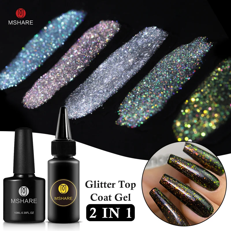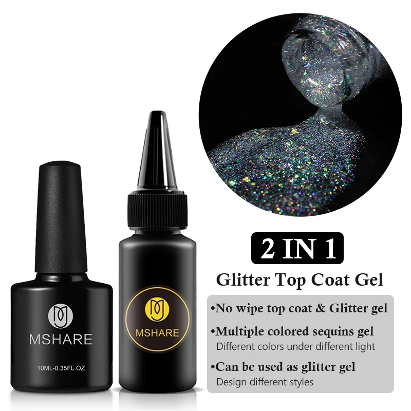 5. Appliquez MSHARE GLITTER TOP COAT et faites durcir sous la lampe à ongles pendant 30 à 60 secondes.