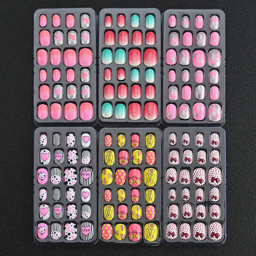 Boîte de faux ongles en acrylique Kawaii pour enfants, 24 pièces/boîte, couverture complète, à presser, faux ongles artificiels pour filles