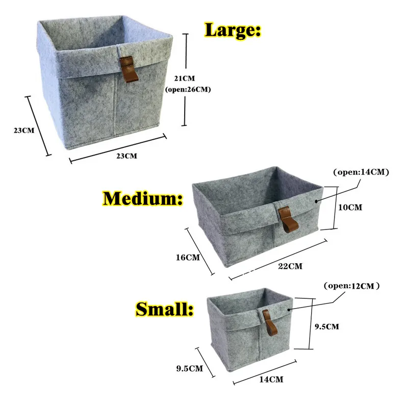 La boîte de rangement est disponible en trois tailles : grand (23*23*26cm), moyen (22X16X10cm) et petit (14X9.5X9.5cm).