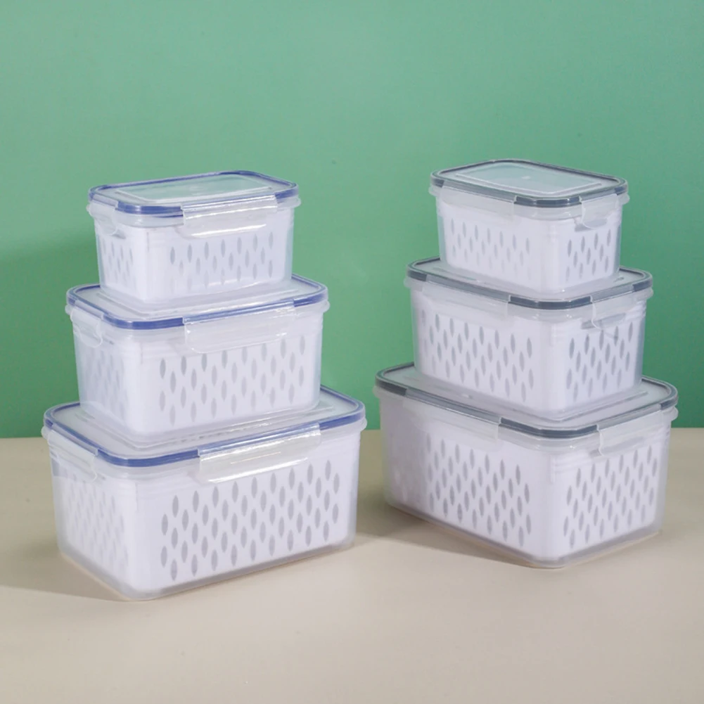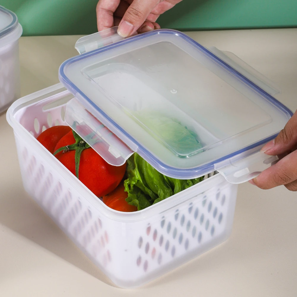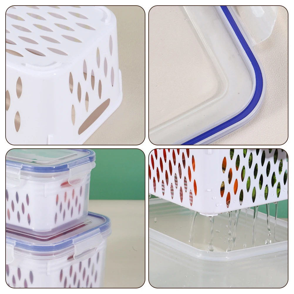 - * Conception de drainage: Nos contenants alimentaires sont équipés d’une boîte de drainage amovible à l’intérieur, qui peut séparer efficacement les fruits ou les légumes de l’eau, empêchant ainsi les fruits et légumes de tremper et de pourrir.
