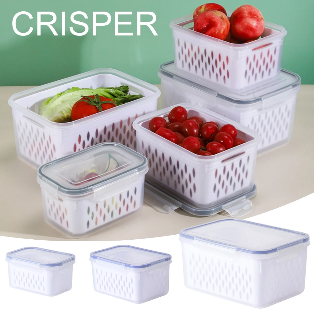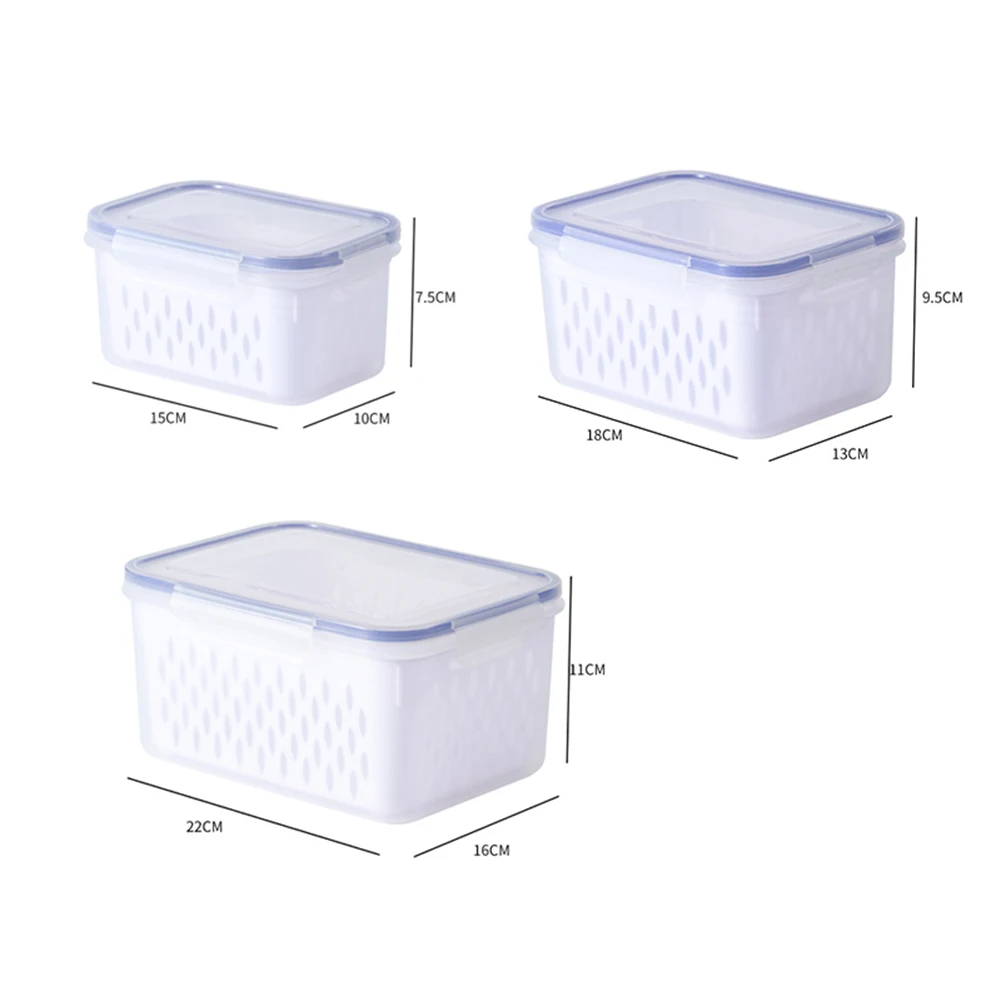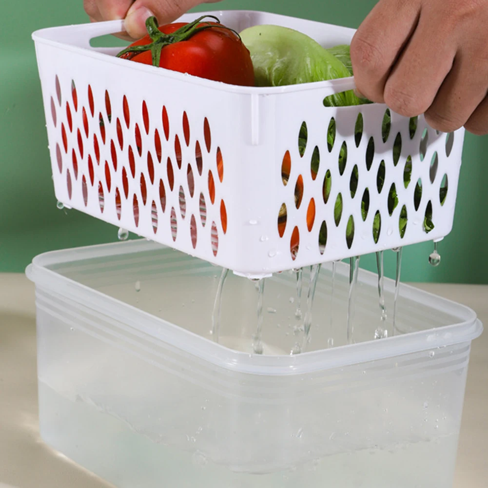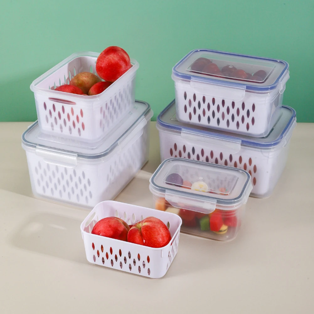 - * Conception de drainage: Nos contenants alimentaires sont équipés d’une boîte de drainage amovible à l’intérieur, qui peut séparer efficacement les fruits ou les légumes de l’eau, empêchant ainsi les fruits et légumes de tremper et de pourrir.