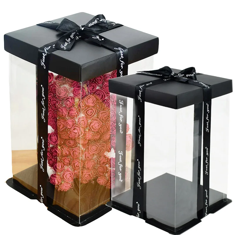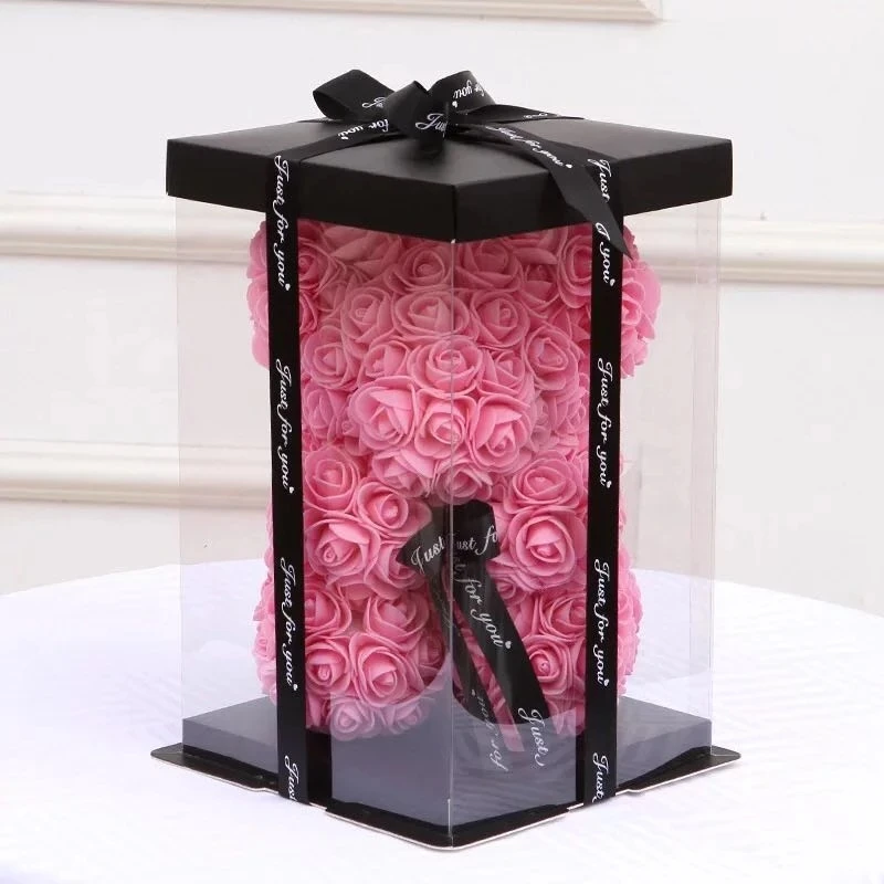 20/28cm Artificial Rose Foam Bear Transparent Box Valentine’s Day Flower Gifts Cake Packing Box For Wedding Birthday Party Decor