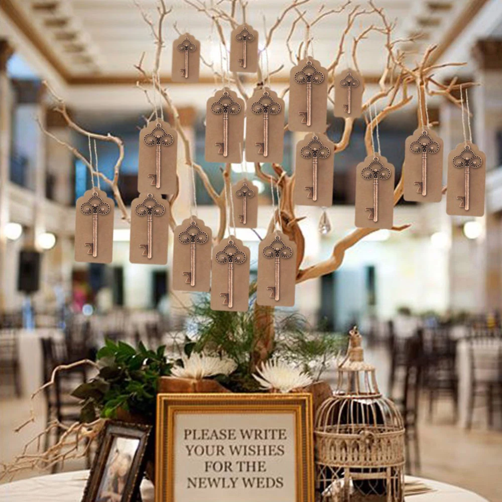 - Les tons de cuivre sur la clé, la carte marron pastel et la ficelle accentuent votre décor de mariage