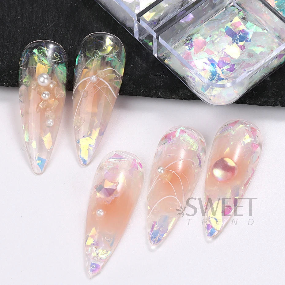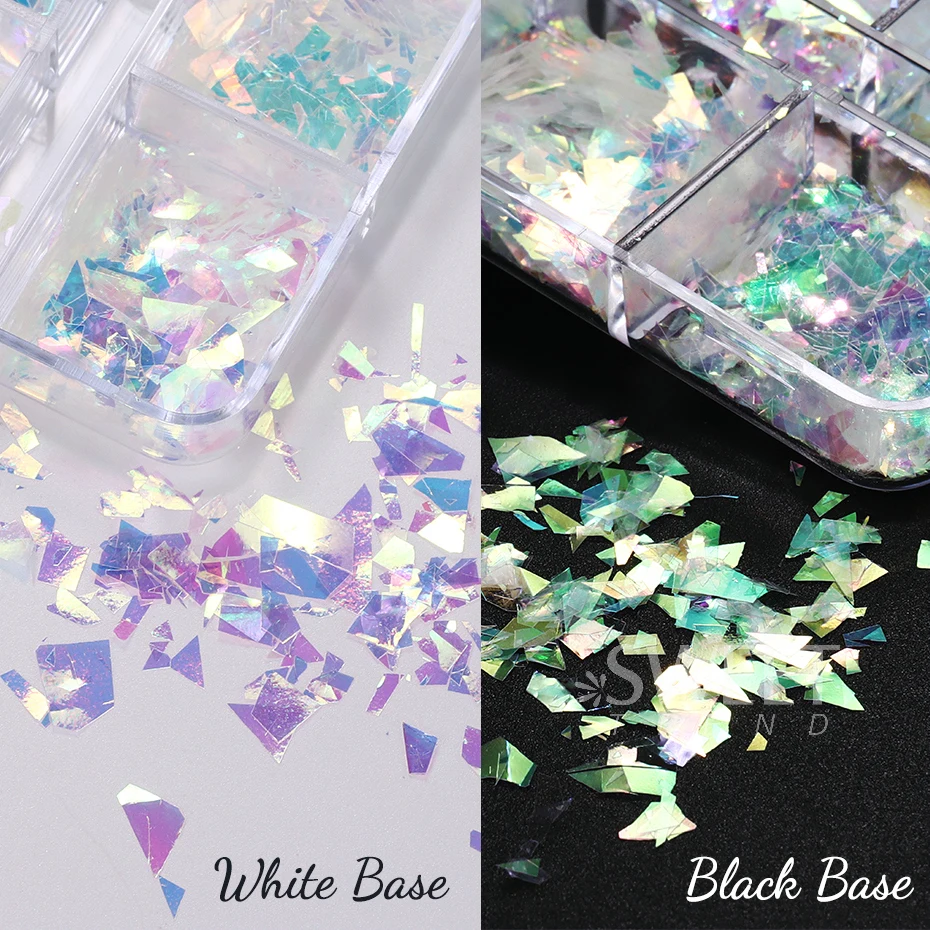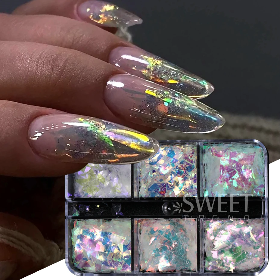 Les paillettes irisées AB pour ongles sont des flocons irréguliers qui offrent un effet holographique, Aurora, Rotterdam, cristal et verre nickelé. Elles sont idéales pour la décoration de manucure en DIY. Chaque paquet contient 6 grilles de paillettes pour ongles.