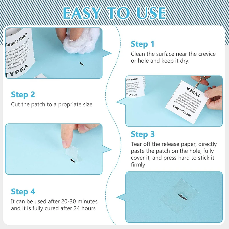 Le ruban de tente étanche est facile à appliquer. Vous devez nettoyer la surface près de la crevasse ou du trou et la garder au sec avant utilisation. Ensuite, déchirez le papier de dégagement, collez directement le patch sur le trou, couvrez-le complètement et appuyez fort pour le faire coller fermement. Attendez 20-30 minutes et vous pourrez l’utiliser. Après 24 heures, il sera complètement durci.