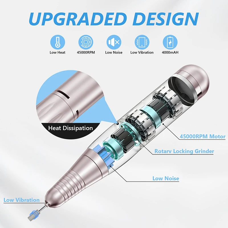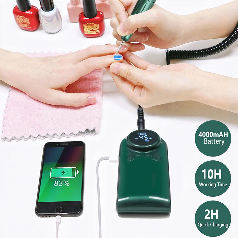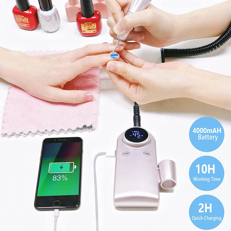 Avec sa batterie intégrée de grande capacité (4000mAh), cette lime à ongles électrique peut fonctionner jusqu’à 10 heures après une seule charge. Grâce à sa conception portable, vous pouvez l’emporter partout avec vous et l’utiliser à tout moment. De plus, vous pouvez également l’utiliser comme une banque d’alimentation pour charger votre téléphone en cas d’urgence. Plus besoin de chercher une prise électrique lorsque vous voyagez!