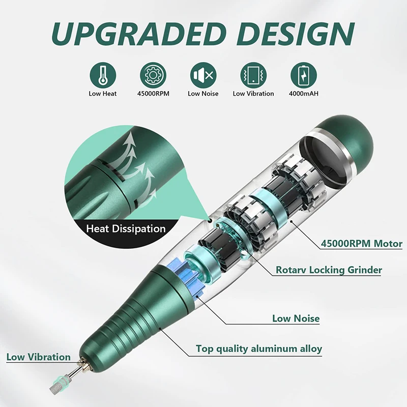 La perceuse à ongles MS901 45000RPM est fabriquée en alliage d’aluminium, ce qui lui confère une grande durabilité. Sa conception améliorée de la pièce à main offre une excellente prise en main et une utilisation confortable. De plus, les nombreux trous de ventilation permettent une dissipation efficace de la chaleur, ce qui réduit le risque de surchauffe et prolonge la durée de vie de l’appareil.