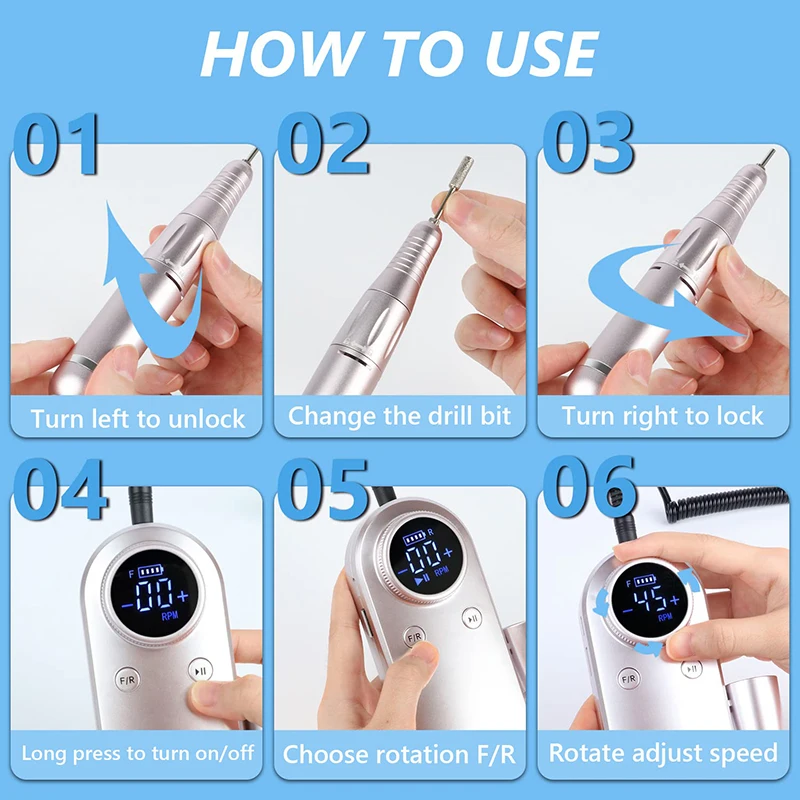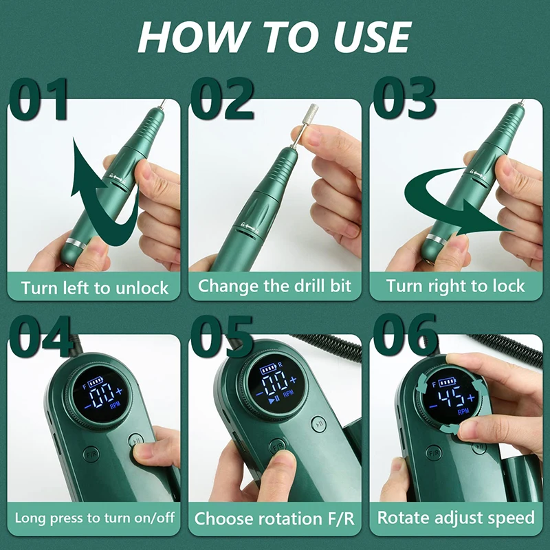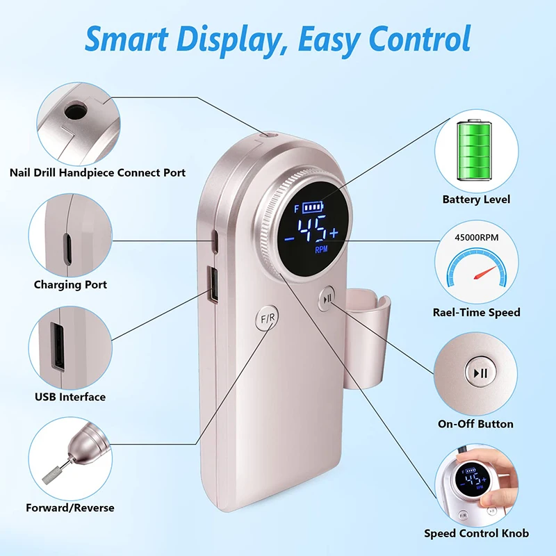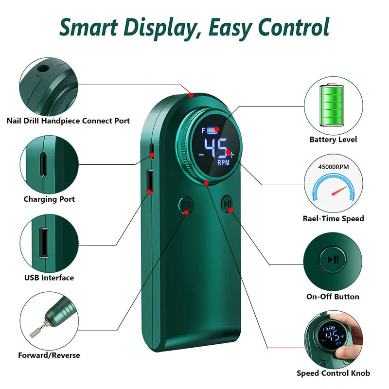 Cette perceuse à ongles est équipée d’un roulement de haute qualité qui lui permet de fonctionner en douceur à des vitesses allant jusqu’à 45000 tr/min. Vous pouvez facilement régler la vitesse en tournant le bouton de contrôle, et l’écran LCD intelligent affiche clairement toutes les informations nécessaires. Que vous ayez besoin d’une vitesse élevée pour enlever les callosités ou d’une vitesse plus faible pour polir vos ongles, cette machine de manucure s’adapte à tous vos besoins.