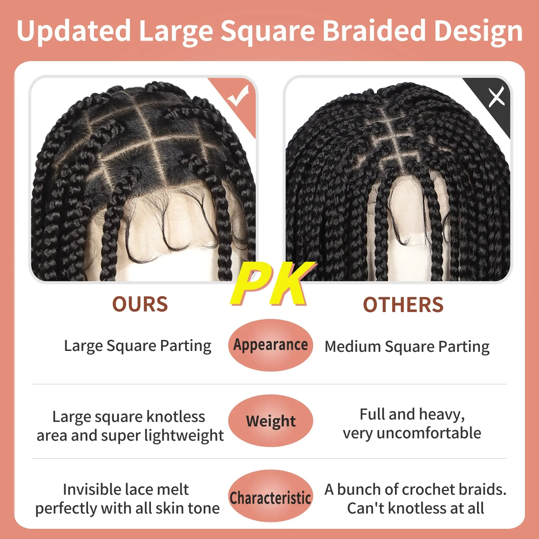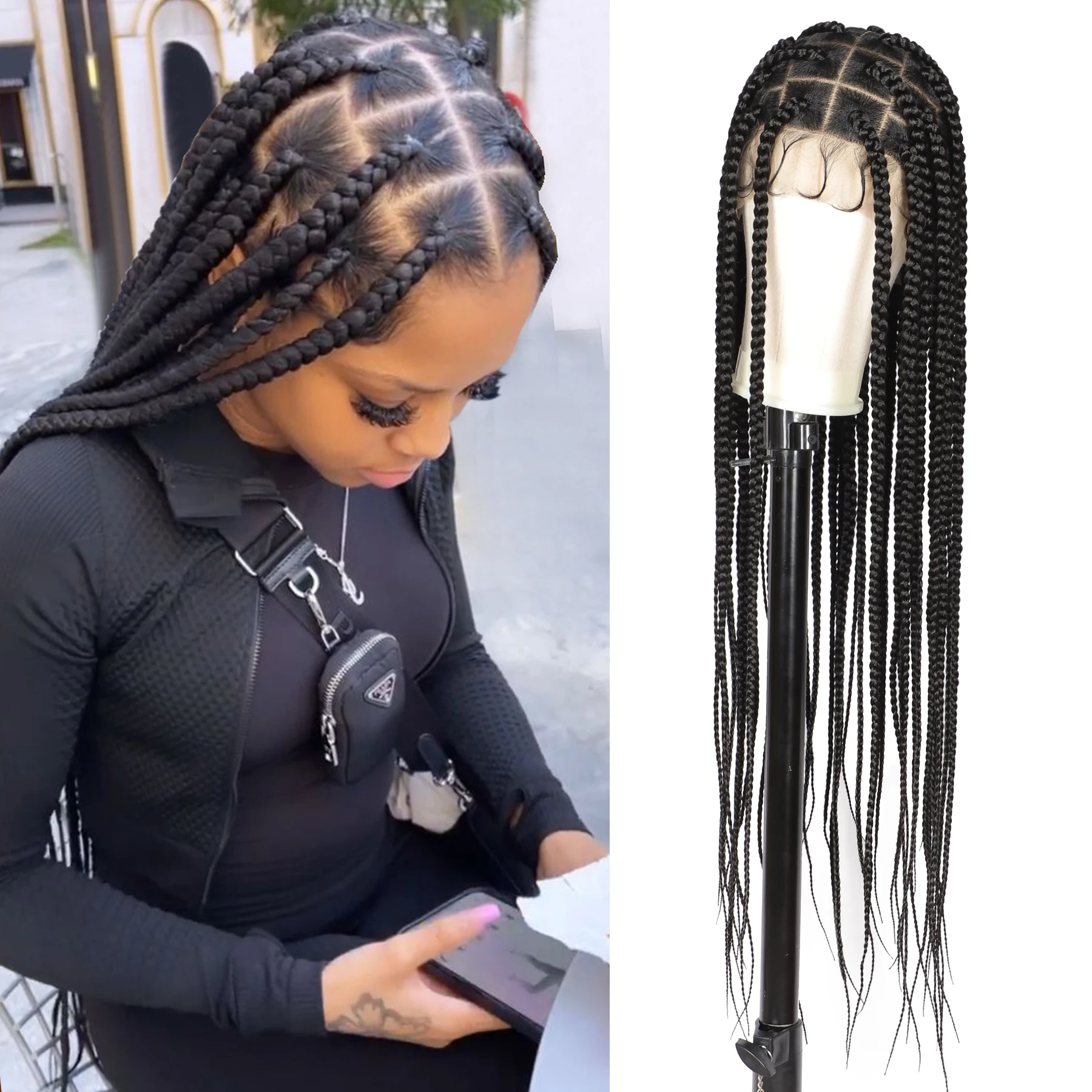 Les perruques tressées carrées sans nœuds sont de grande taille, offrant une grande boîte carrée sans nœuds qui peut être séparée n’importe où. Vous pouvez créer différentes coiffures comme une queue de cheval haute, un chignon ou un chignon, etc.