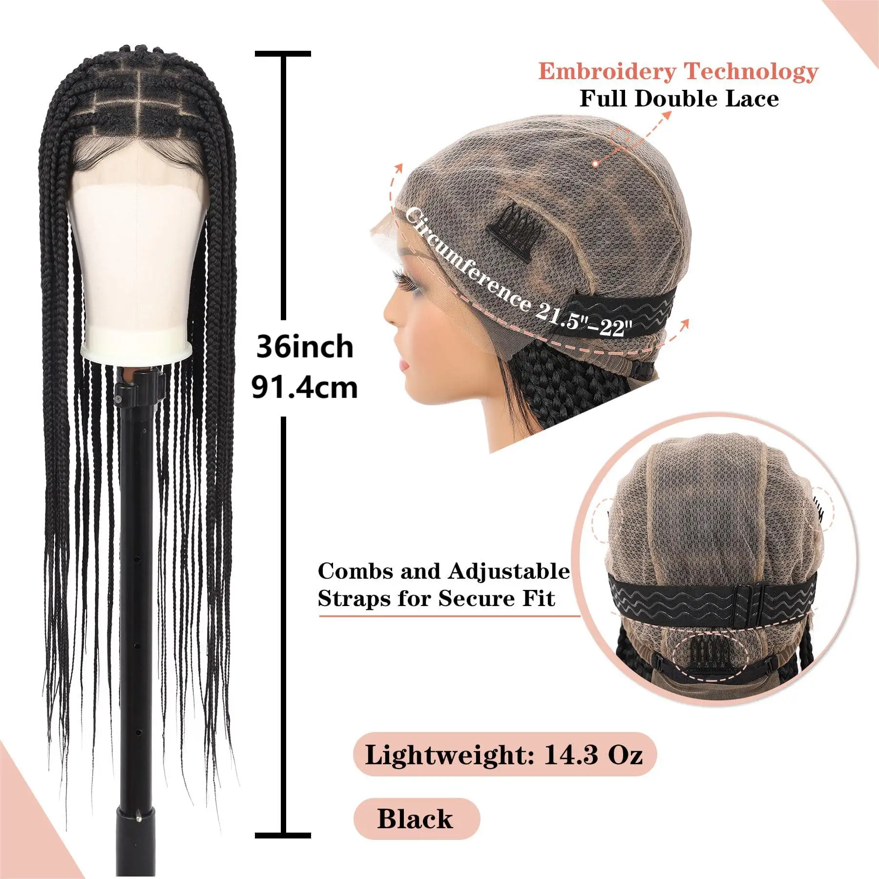 Les perruques tressées en dentelle de Kalyss sont dotées de peignes et de sangles réglables pour assurer un ajustement sûr. Les perruques ont une circonférence de bonnet de 22-22,5 pouces, convenant à la plupart des tailles de tête.