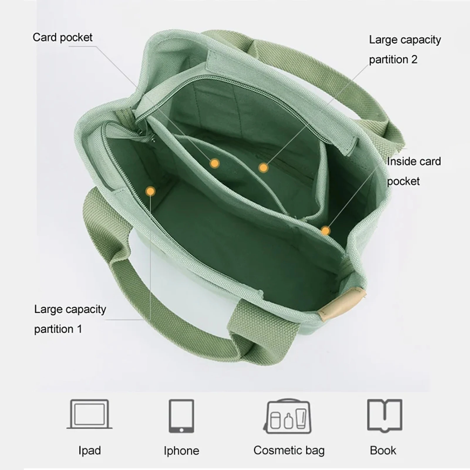 En conclusion, le petit sac à main en toile avec fermeture éclair pour femme, bento portable, boîte à lunch simple, multi-poches, couche-culotte, mère, bébé, design japonais est un accessoire pratique et polyvalent. Avec sa capacité raisonnable et sa résistance aux éclaboussures, il répondra à tous vos besoins quotidiens. Son design élégant en fait un choix idéal pour les femmes à la recherche d’un sac à main fonctionnel et tendance.
