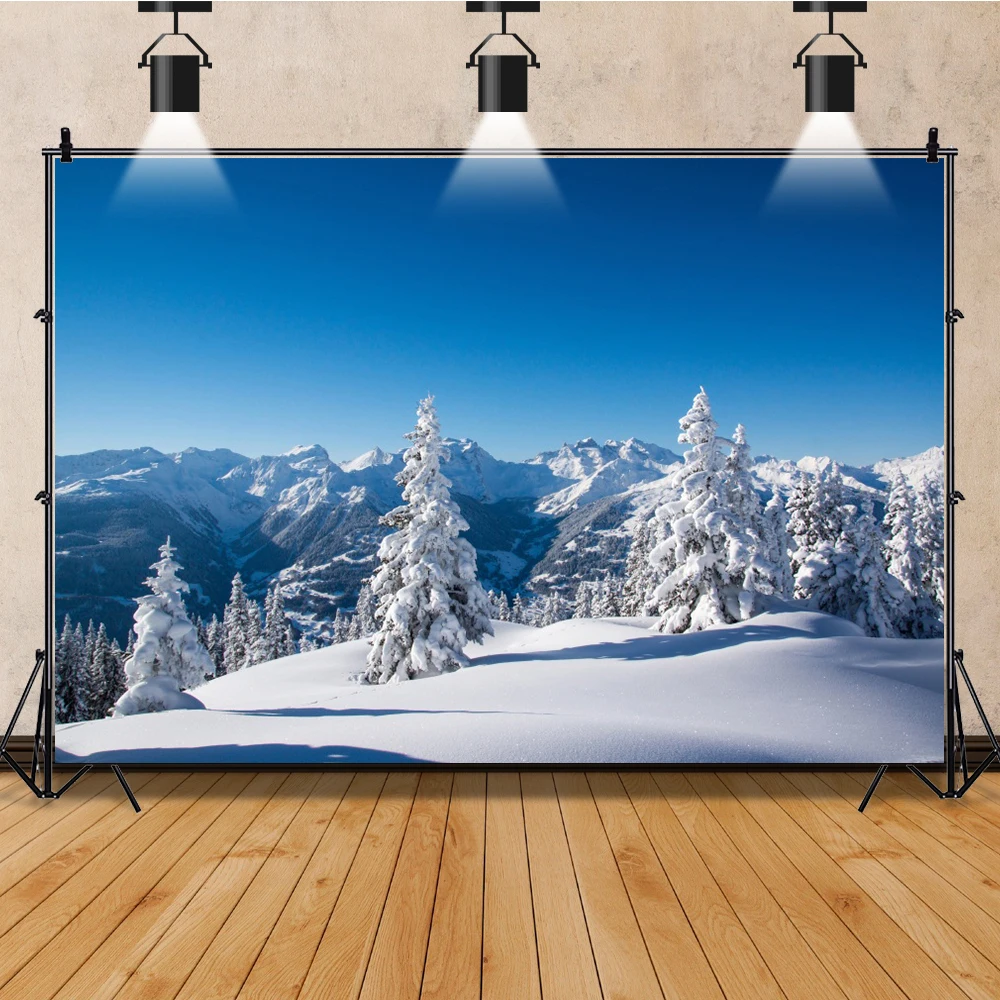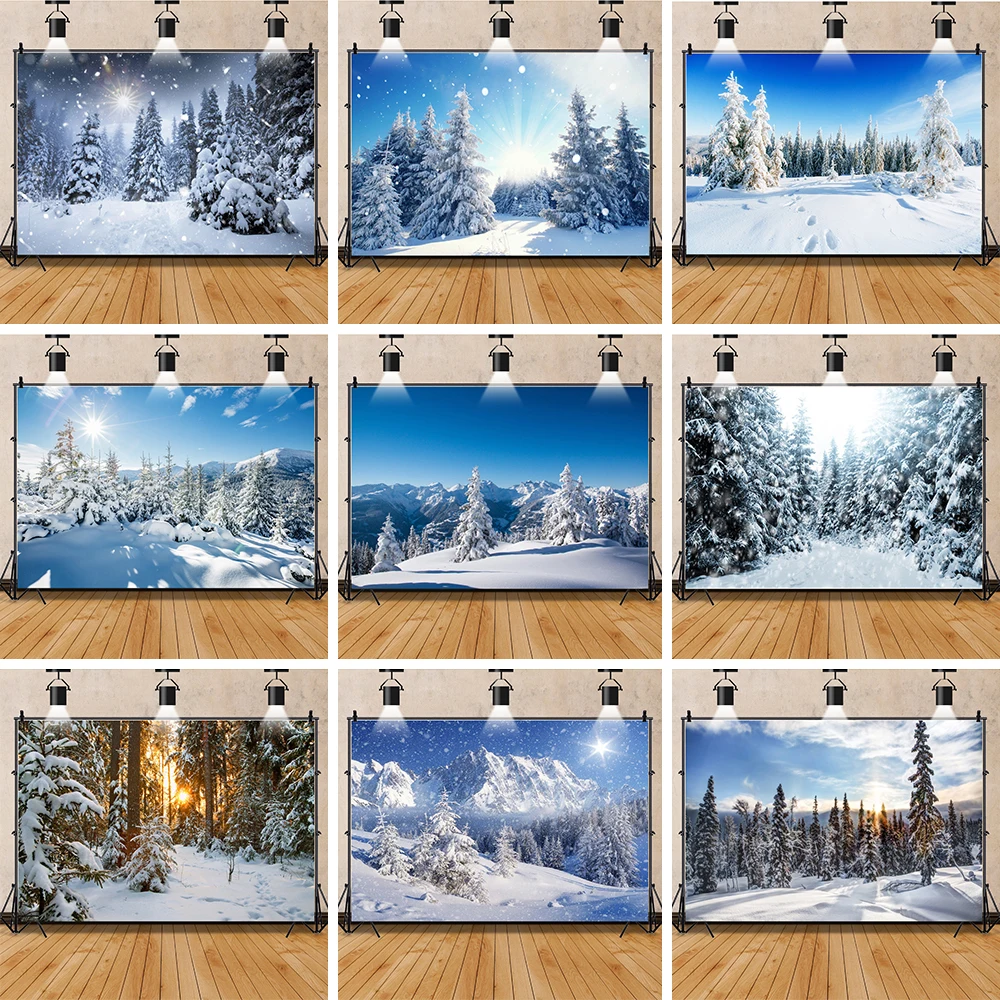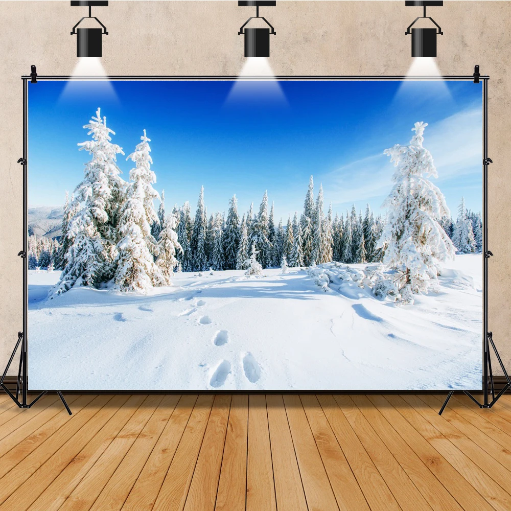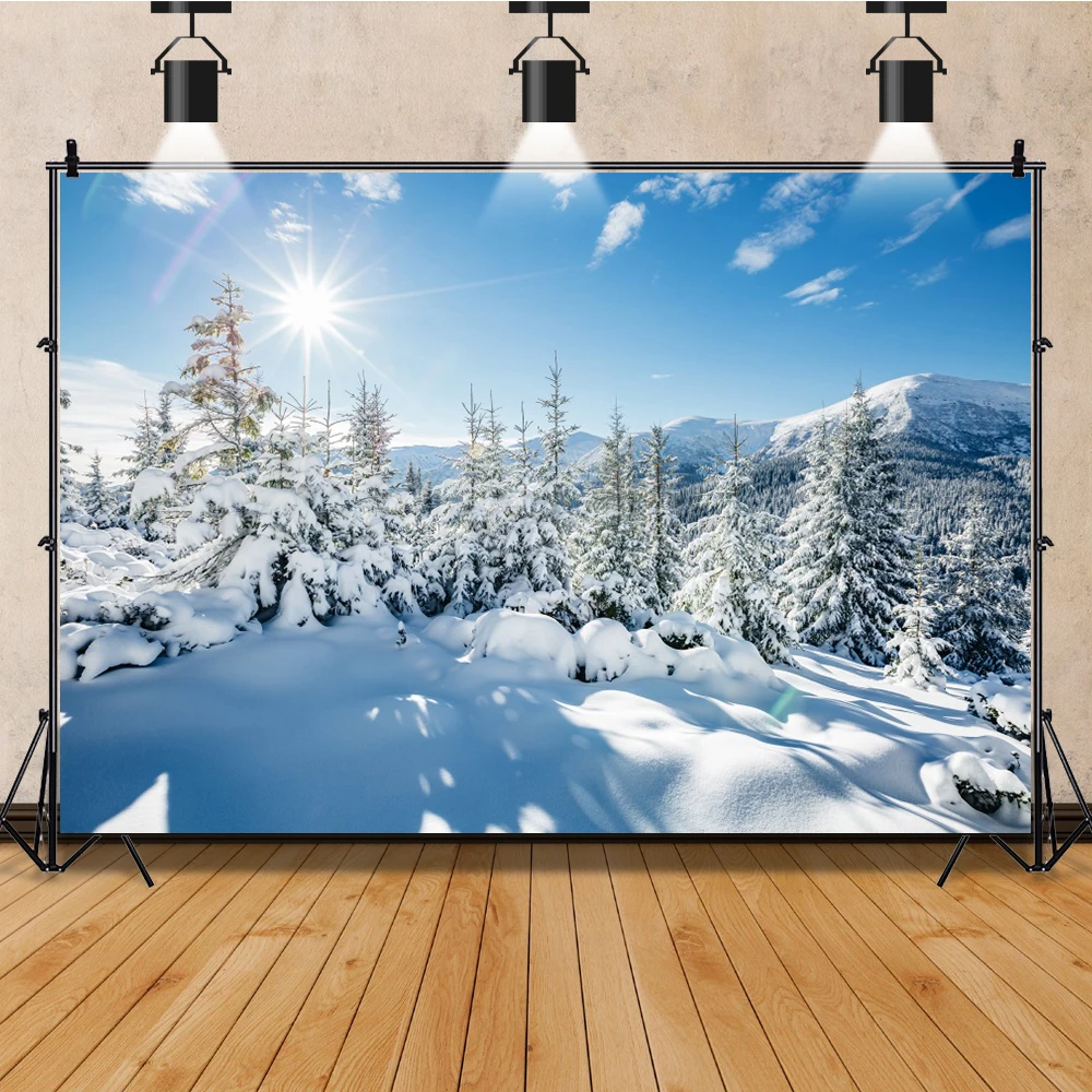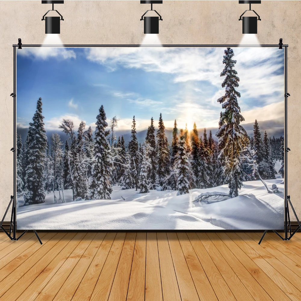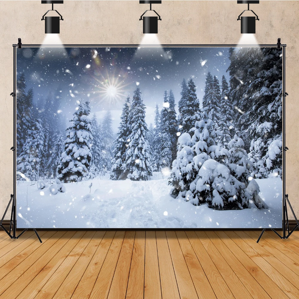 Laeacco-Toile de fond de photographie d’hiver rêveur, arbres enrichis, neige luisante, forêt, fête de famille, studio