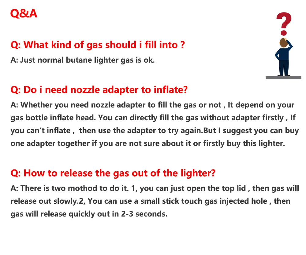Comme les exigences du transport aérien international, tous nos briquets libéreront du gaz avant de vous envoyer, s’il vous plaît remplir le gaz et ensuite utiliser lorsque vous recevez plus léger!!!