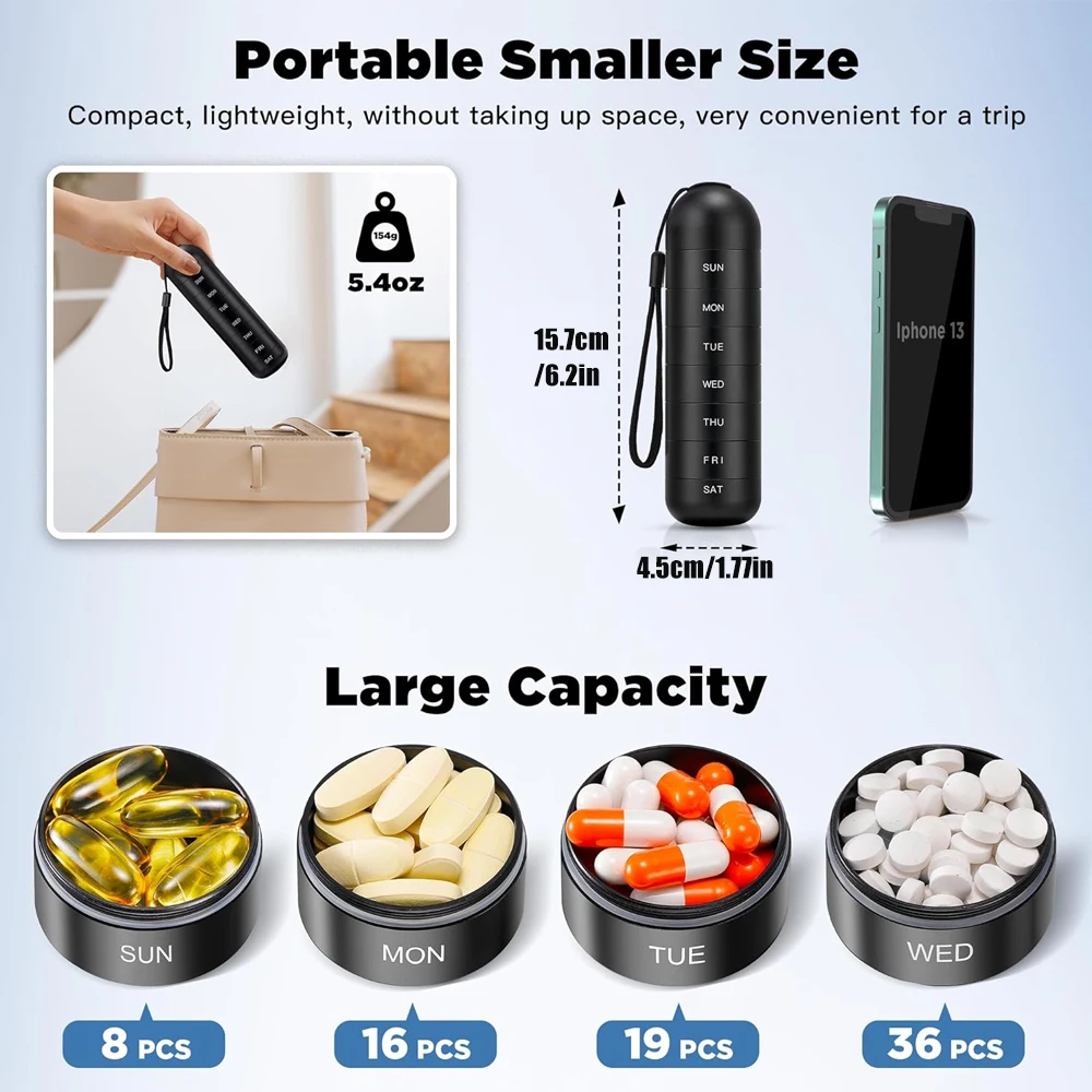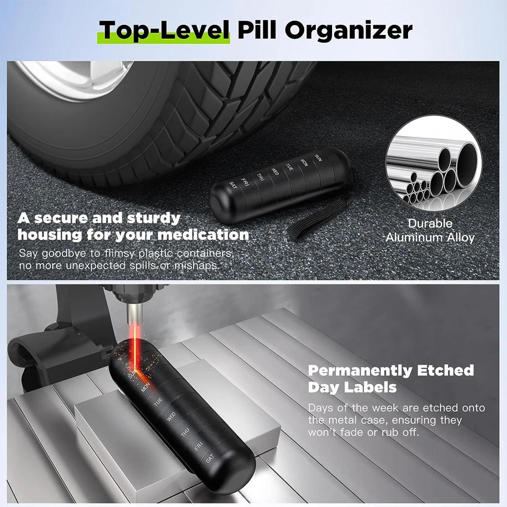 Le pilulier hebdomadaire avec compartiment empilable en alliage d’aluminium est un excellent choix pour les personnes qui ont besoin d’organiser leurs médicaments. Sa grande capacité de 7 jours permet de stocker suffisamment de pilules pour une semaine entière. L’alliage d’aluminium de qualité supérieure garantit sa durabilité et sa légèreté, tandis que sa conception étanche à l’humidité protège les médicaments de l’humidité et de l’eau. De plus, les impressions de sculpture au laser assurent une meilleure lisibilité des étiquettes de date.