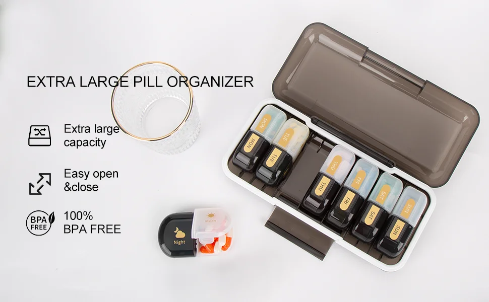 En tant qu’expert en boîtes à pilules, je trouve que cette boîte à pilules hebdomadaire extra large est un excellent choix pour les personnes qui ont besoin de prendre plusieurs médicaments chaque jour. Sa grande capacité permet de stocker jusqu’à 16 huiles de poisson ou 20 vitamines par compartiment. De plus, les 7 boîtes amovibles, avec une couleur différente par jour, facilitent le transport et la distinction des médicaments. La protection à trois couches offre une meilleure sécurité pour les médicaments, et le système d’ouverture facile permet une extraction rapide des pilules.