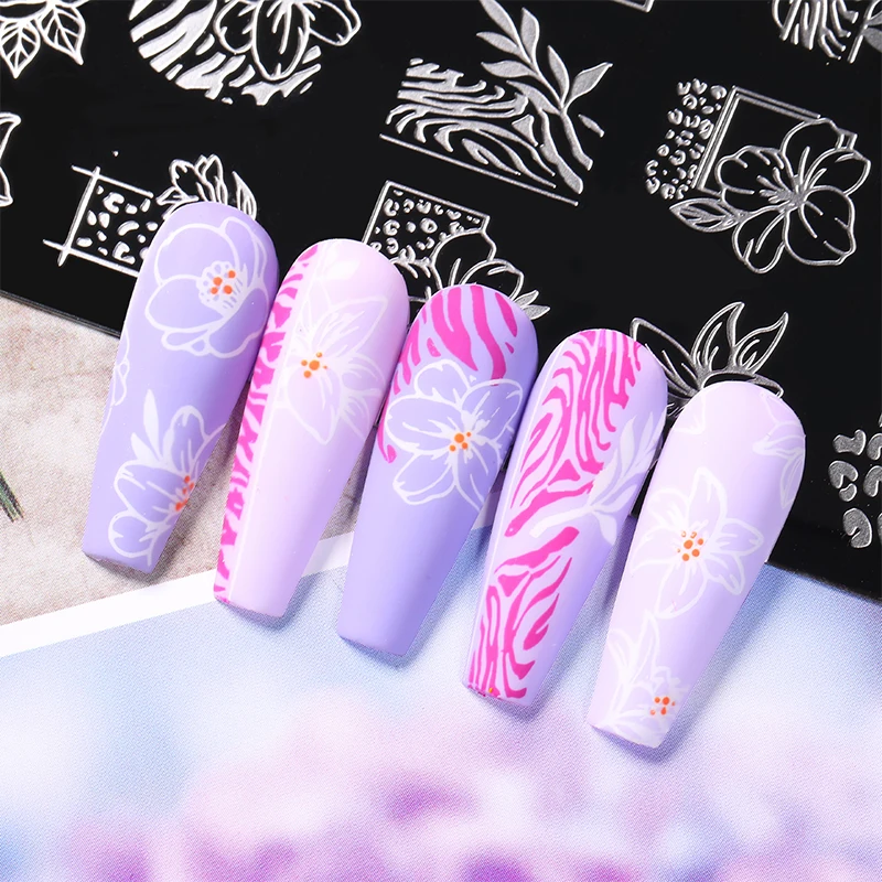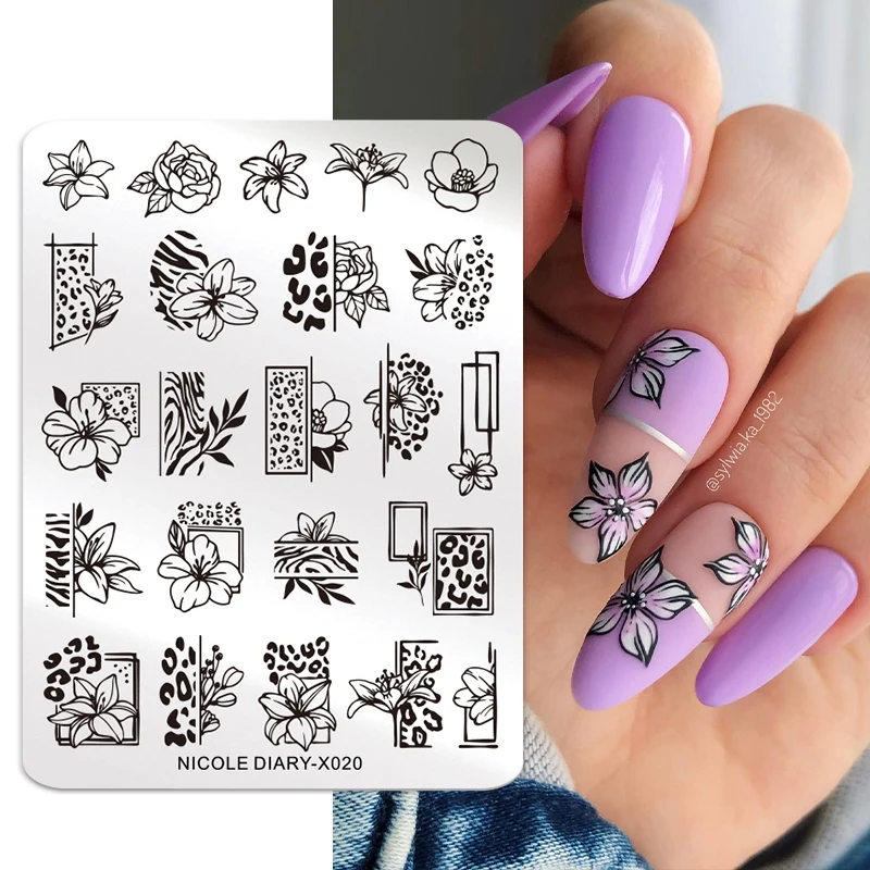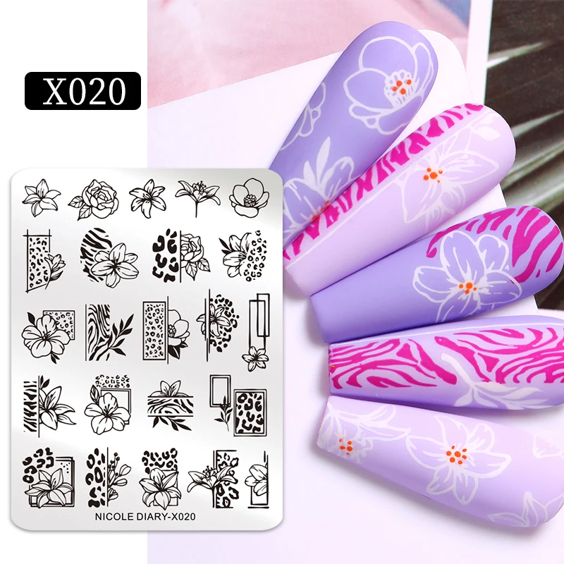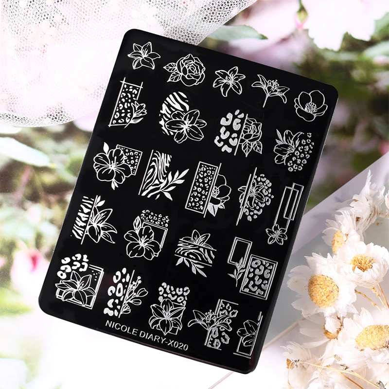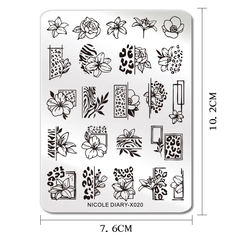 Cette plaque d’estampage pour ongles de la marque NICOLE DIARY propose un design comprenant des motifs de léopard, de fleurs et de géométrie du cuir chevelu.