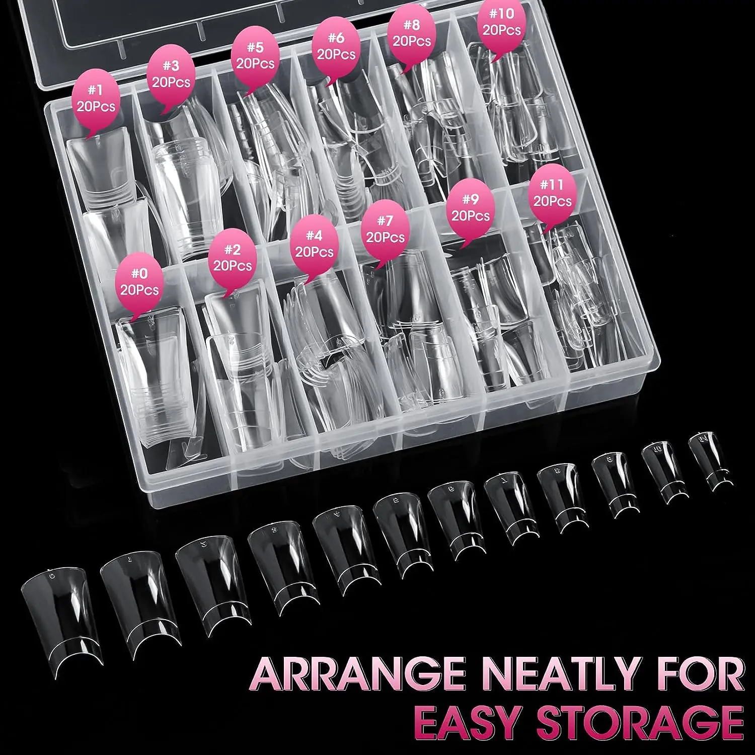 Il y a 240 pièces de pointes d’ongles en acrylique, et les pointes d’ongles transparentes sont disponibles en 12 tailles différentes pour s’adapter aux doigts de la plupart des gens. Le nombre 0-11 est clairement gravé sur les pointes des ongles de canard. Chaque taille a 20 pièces, de sorte que vous pouvez trouver les pointes d’ongles de style pieds de canard en cristal appropriées avec précision et rapidité lors de l’utilisation. Demi-couverture de faux ongles pour les ongles en acrylique professionnels et débutants.