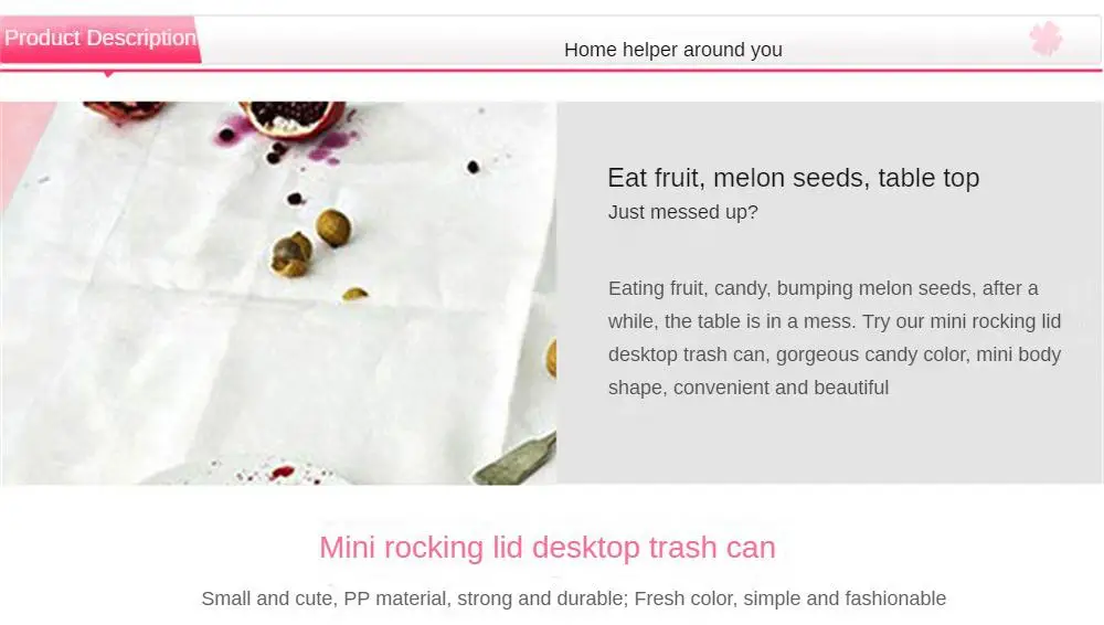 - Résumé du produit: fait de nouveaux matériaux PP, il y a toujours beaucoup de petites ordures dans la maison, il y a une telle mini poubelle, facile à utiliser, pratique et rapide