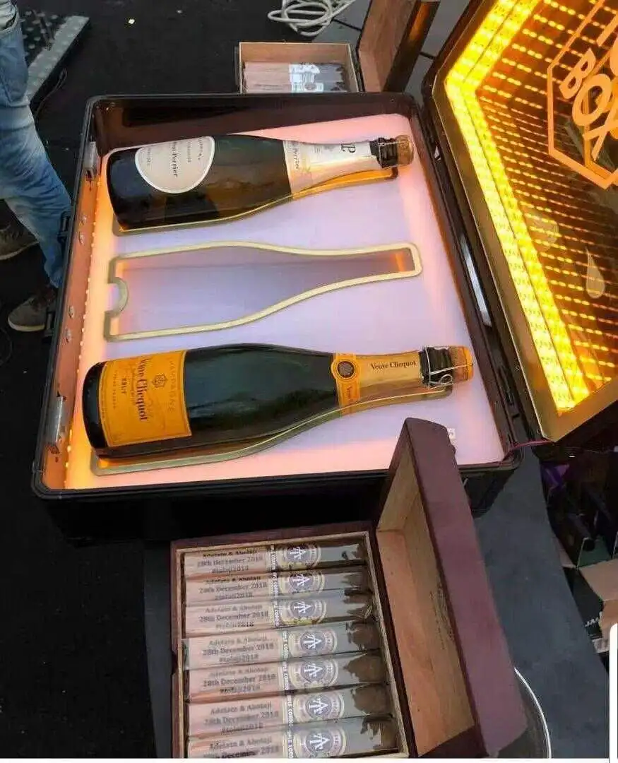 Nom du produitPrésentoir de bouteilles de champagne Ace personnalisé, porte-bêche LED, boîte de transport, mallette de présentation, valise de boîte de nuit, 3 bouteilles