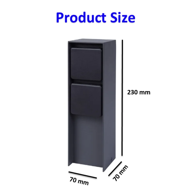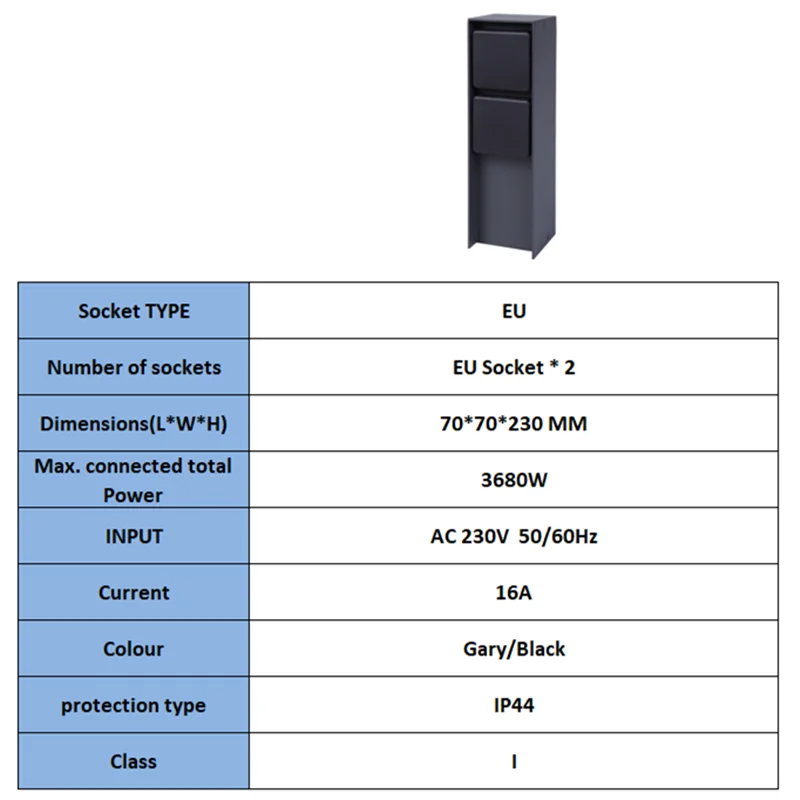 Vous pouvez fixer cette colonne d’alimentation au sol à l’aide de vis ou d’un piquet en option. Elle se connecte à une tension de 230 V et supporte une charge maximale de 3680 W à 16A. Ajoutez une touche de décoration à votre jardin tout en profitant de la commodité de l’électricité en extérieur.