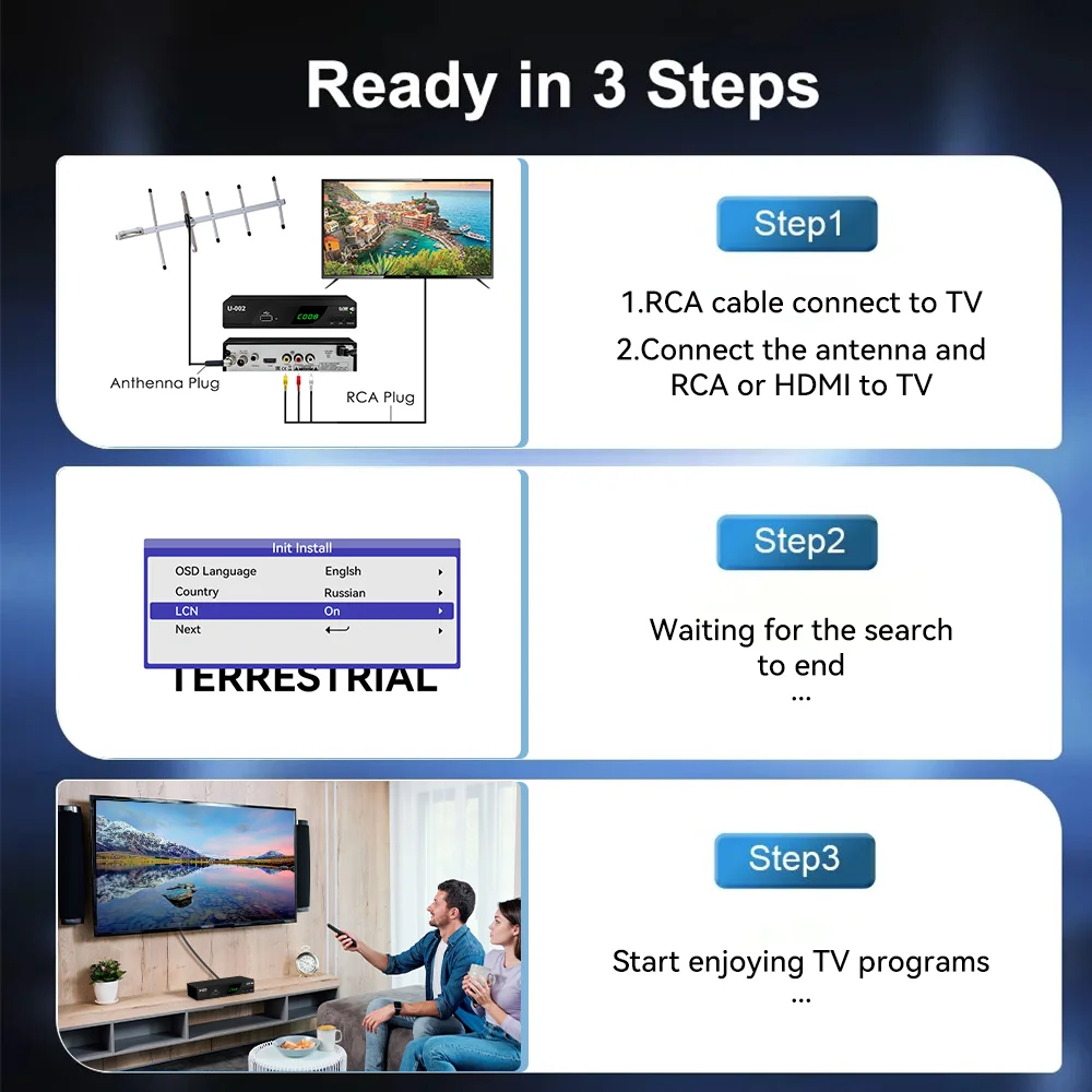 L’installation de ce décodeur est très simple. Vous pouvez le connecter à votre téléviseur à l’aide d’un câble RCA ou d’un câble HDMI, en fonction du type de téléviseur que vous avez. Il vous suffit de le brancher et de suivre les instructions pour accéder aux chaînes numériques. Pas besoin d’internet, le décodeur fonctionne très bien avec une antenne d’intérieur.