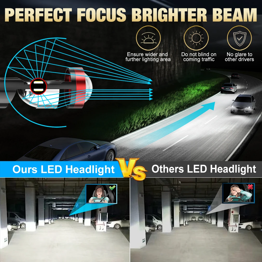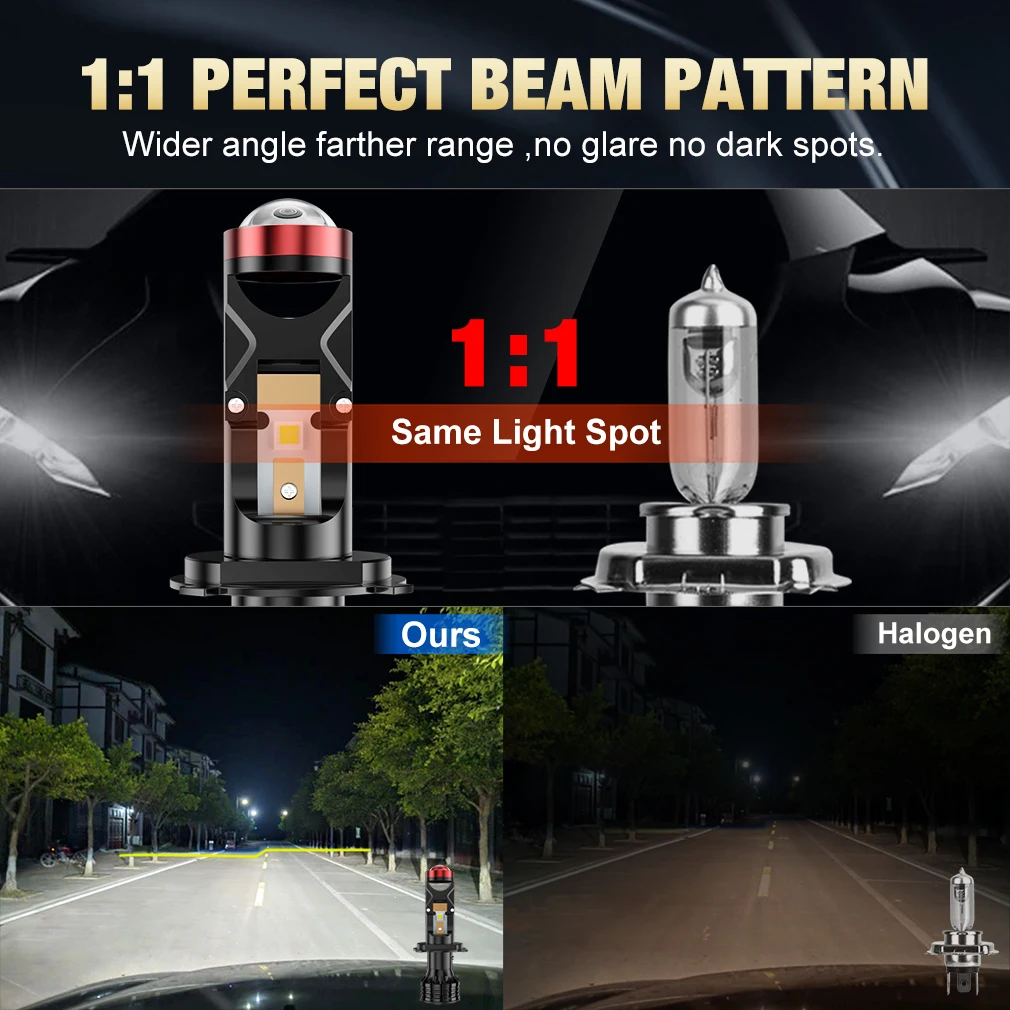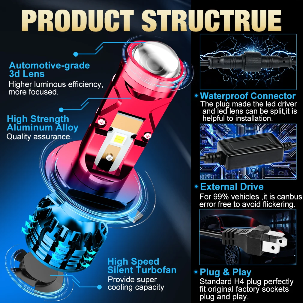 Le Mini projecteur LED 100W H4 H7 est un produit de qualité avec plusieurs avantages. Sa puissance de 100W par paire garantit un éclairage puissant et lumineux. De plus, les puces Led CSP 5050 offrent une superbe luminosité de 22000LM, ce qui permet une visibilité optimale sur la route. La température de couleur de 6000K blanc crée une lumière vive et claire, idéale pour conduire de nuit.