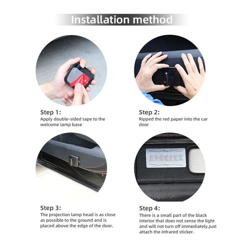 Installation facile, aucun perçage requis. Il suffit de coller la lumière sur le panneau de porte et de coller l’aimant sur le bas du cadre de la voiture. Aucun dommage à votre voiture.