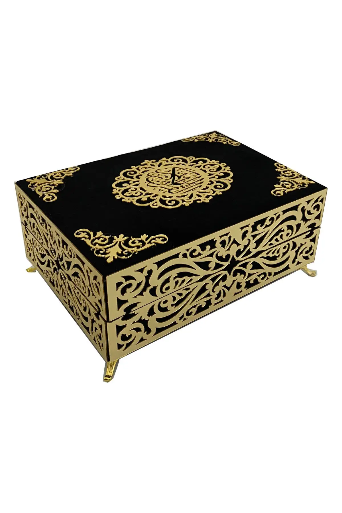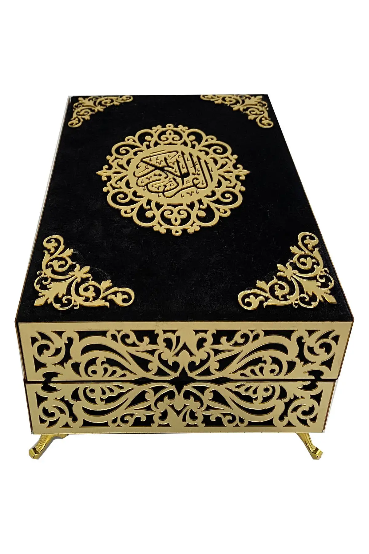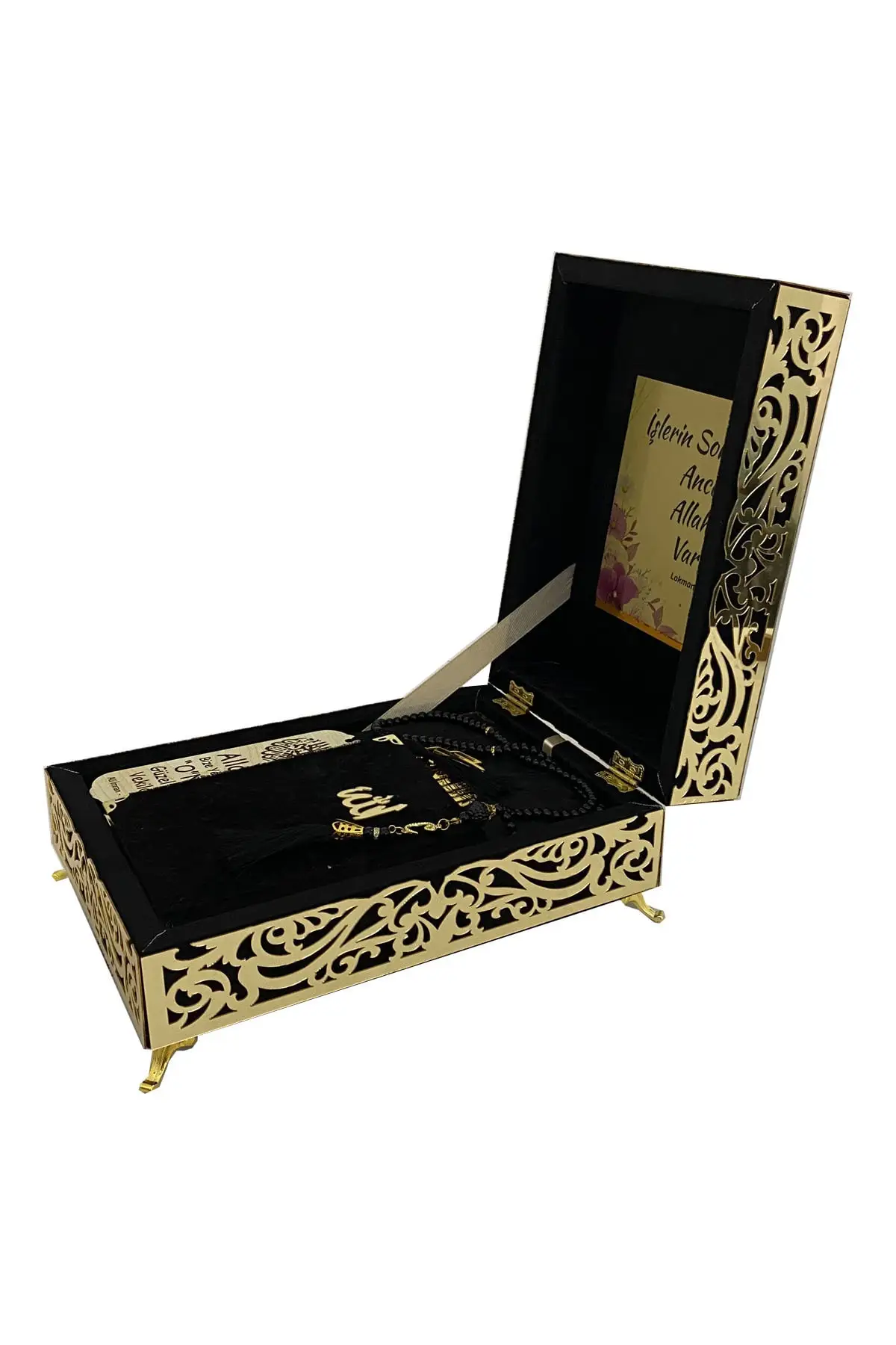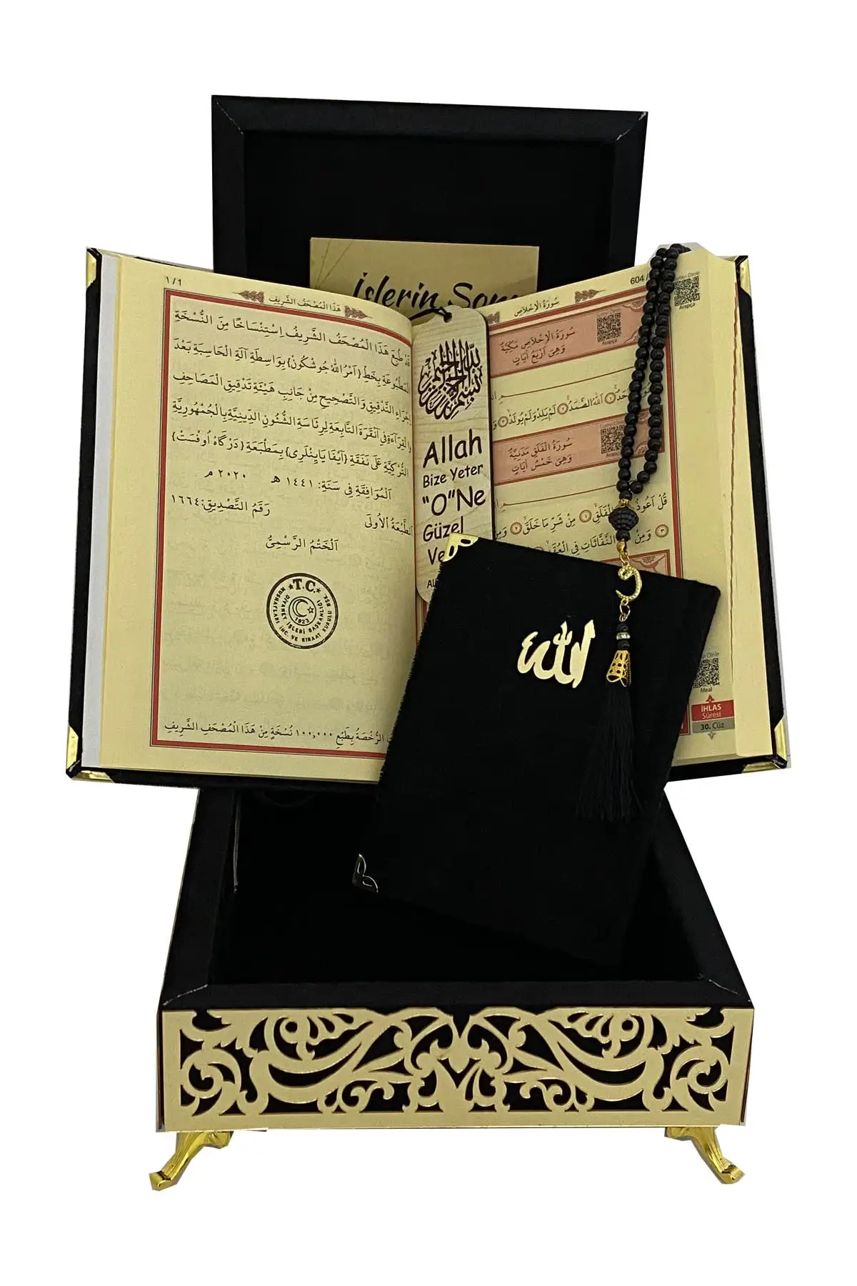 Le coffret cadeau est livré avec un projet de velours entièrement couvert, un Coran couvert de mica, un chapelet perlé et un signet en bois gravé au laser avec des glands.