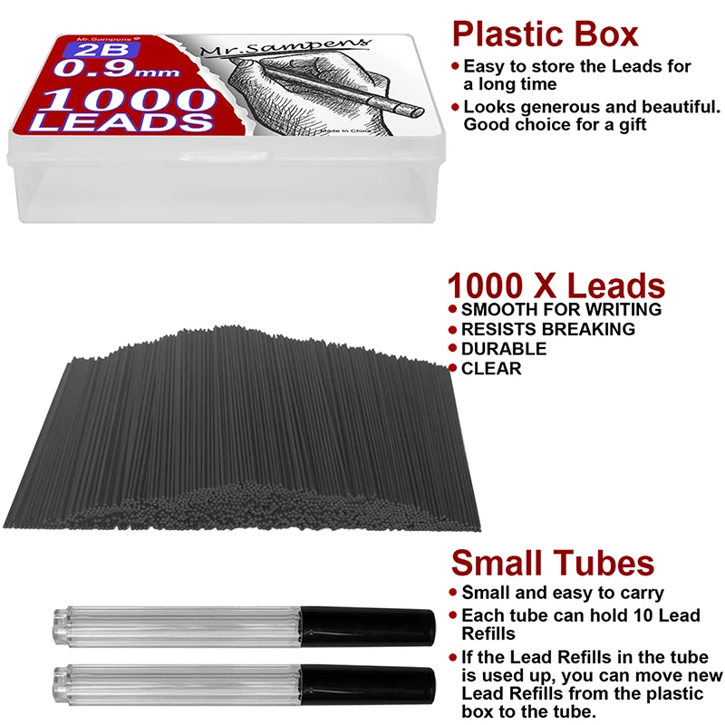 - 1000 mine de crayon mécanique dans une boîte en plastique. Livré avec 2 tubes de transport faciles.