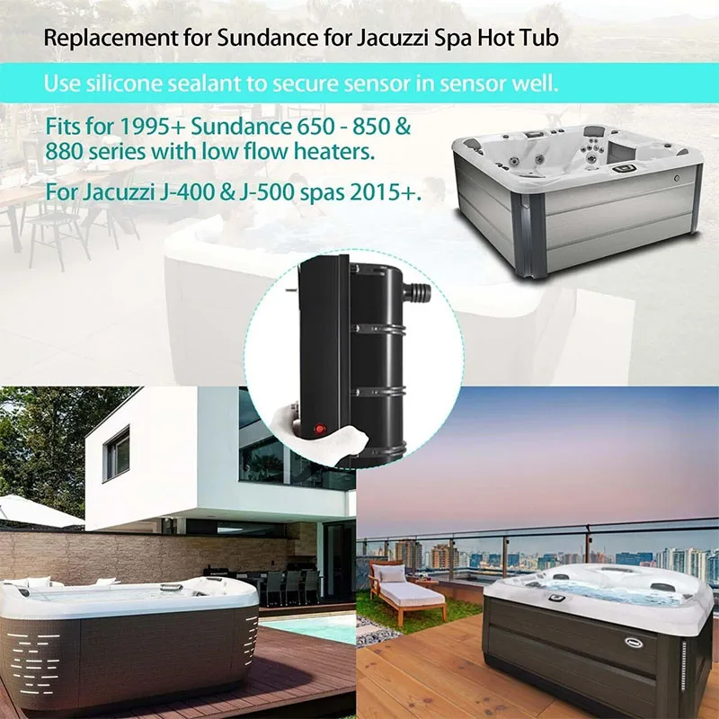 L’ensemble de chauffage intelligent à faible débit pour Sundance, jacuzzi, spa, bain à remous est un remplacement idéal pour les modèles nécessitant une puissance de 5,5 kW. Cet ensemble comprend un élément chauffant en titane et des raccords barbelés de connexion 3/4 « . Il convient aux séries 1995+ 650 – 850 & 880 avec des appareils de chauffage à faible débit, ainsi qu’aux jacuzzis J-400 & J-500 spas à partir de 2015+. Pour l’installation, utilisez du mastic silicone pour fixer solidement le capteur dans le capteur.