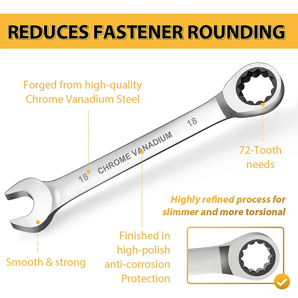 Avec une finition polie et chromée brillante, ces outils sont à la fois résistants à la rouille et esthétiquement agréables. La technologie d’entraînement de 72 dents permet une rotation de 5 degrés, ce qui facilite son utilisation dans des espaces restreints. De plus, les 72 dents assurent une force uniforme et une durée de vie prolongée.