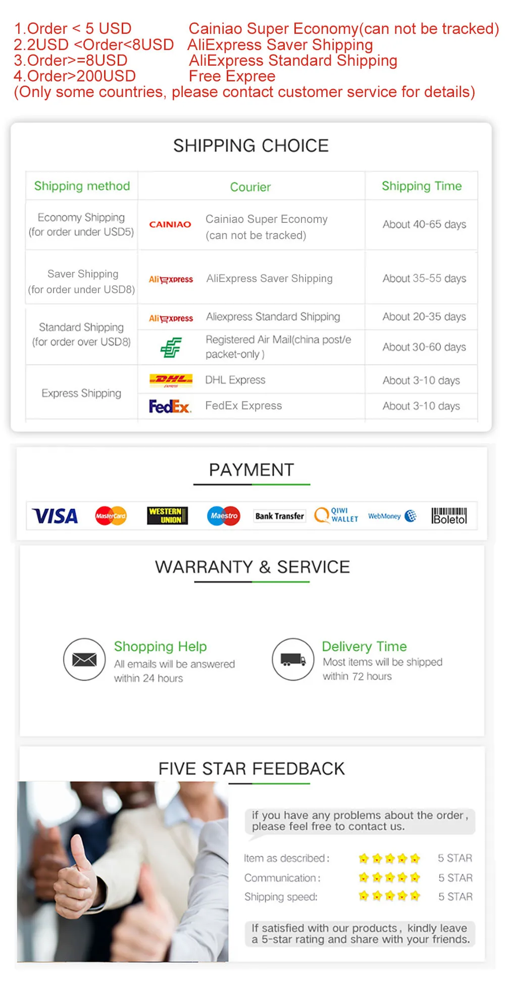 2. Si votre commande est inférieure à 8 $, les informations logistiques ne peuvent pas être suivies (pas de numéro de suivi), la vitesse de livraison est plus lente.