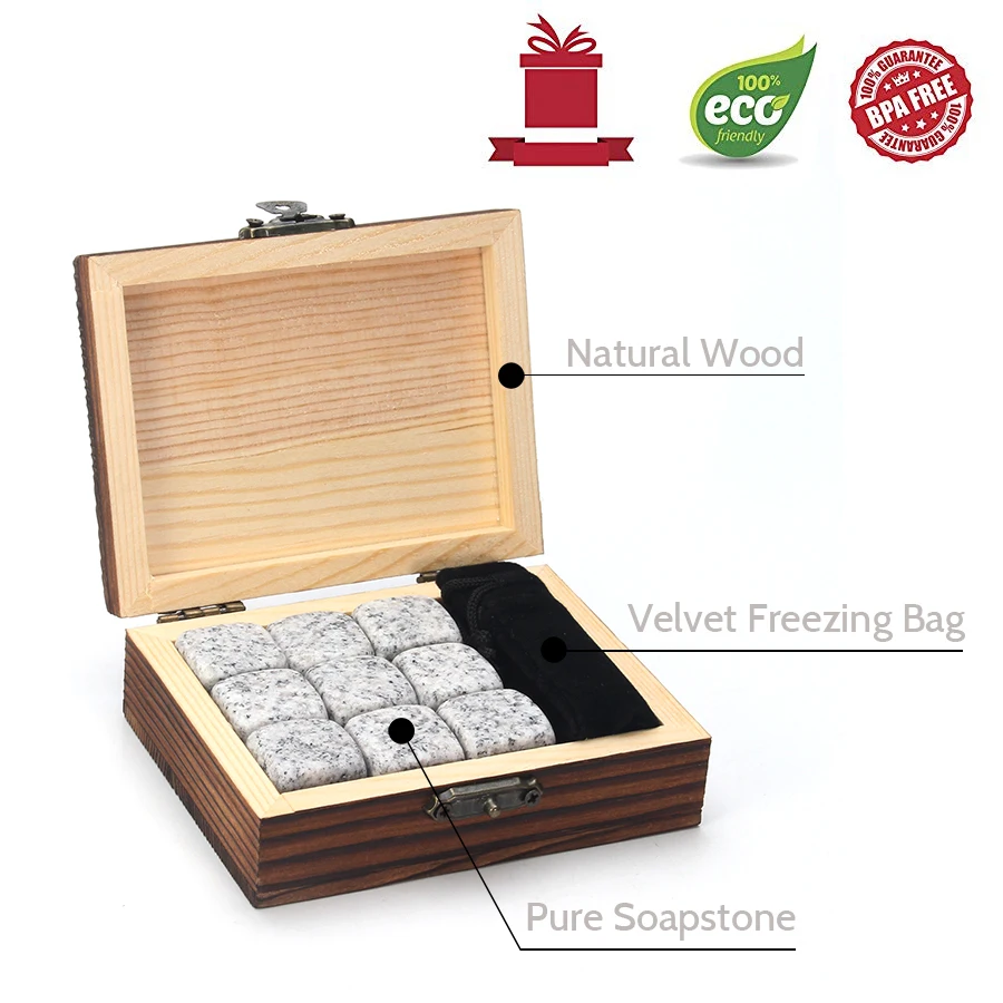 Nos clients apprécieront certainement l’ensemble de glaçons de refroidissement réutilisables pour whisky, 9 roches de granit, boîte en bois, sac en velours. Les avantages de ce produit sont :