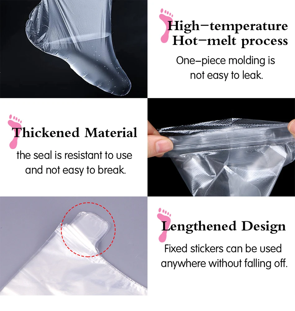Les Sacs transparents pour les pieds de poulet sont fabriqués en plastique PE de haute qualité, ce qui les rend résistants et durables. Ils sont conçus pour protéger vos pieds de la saleté pendant le processus de pédicure, prévenant ainsi les infections qui pourraient survenir. De plus, ces sacs sont inoffensifs et sans odeur, assurant une expérience agréable.