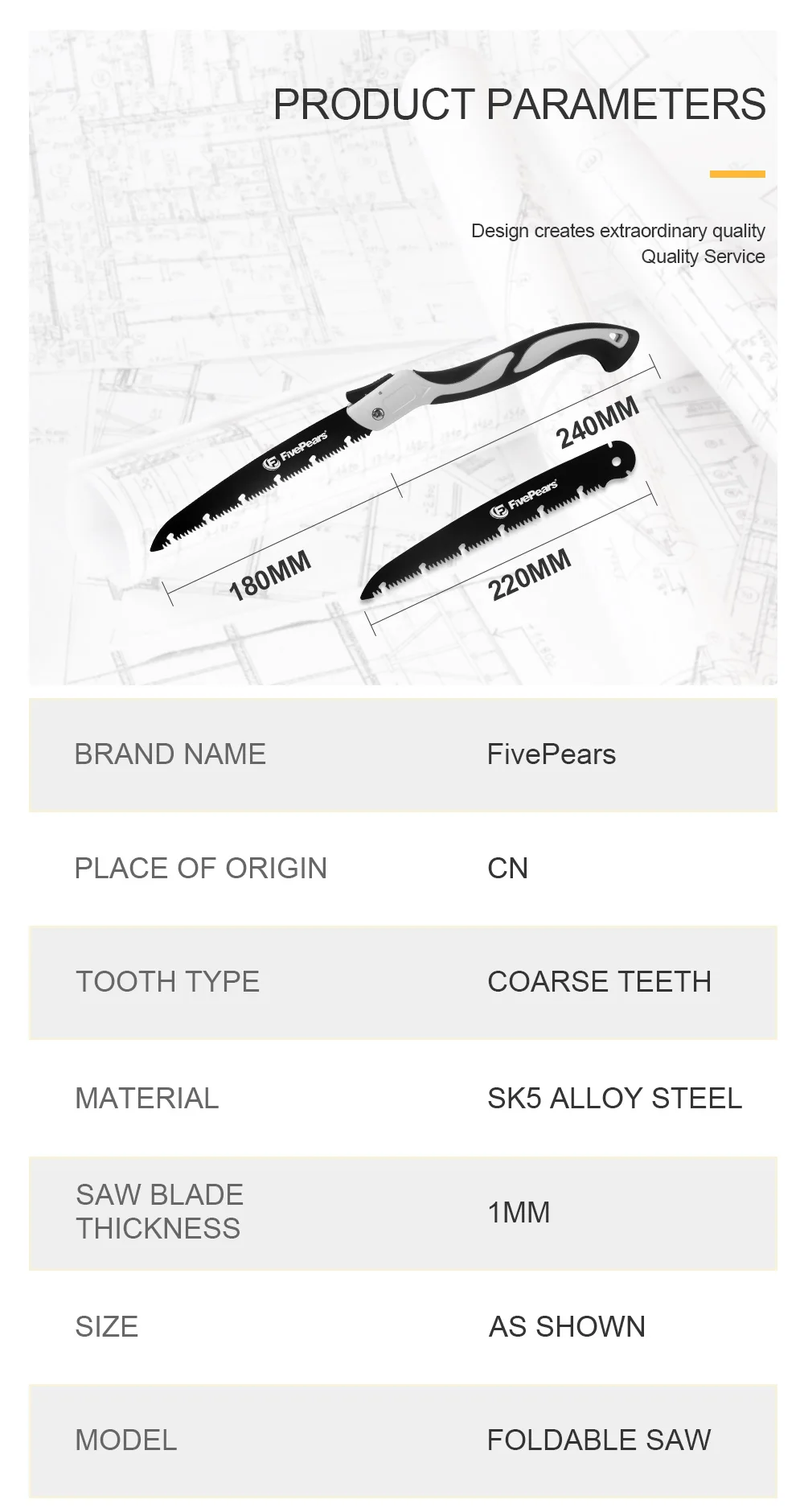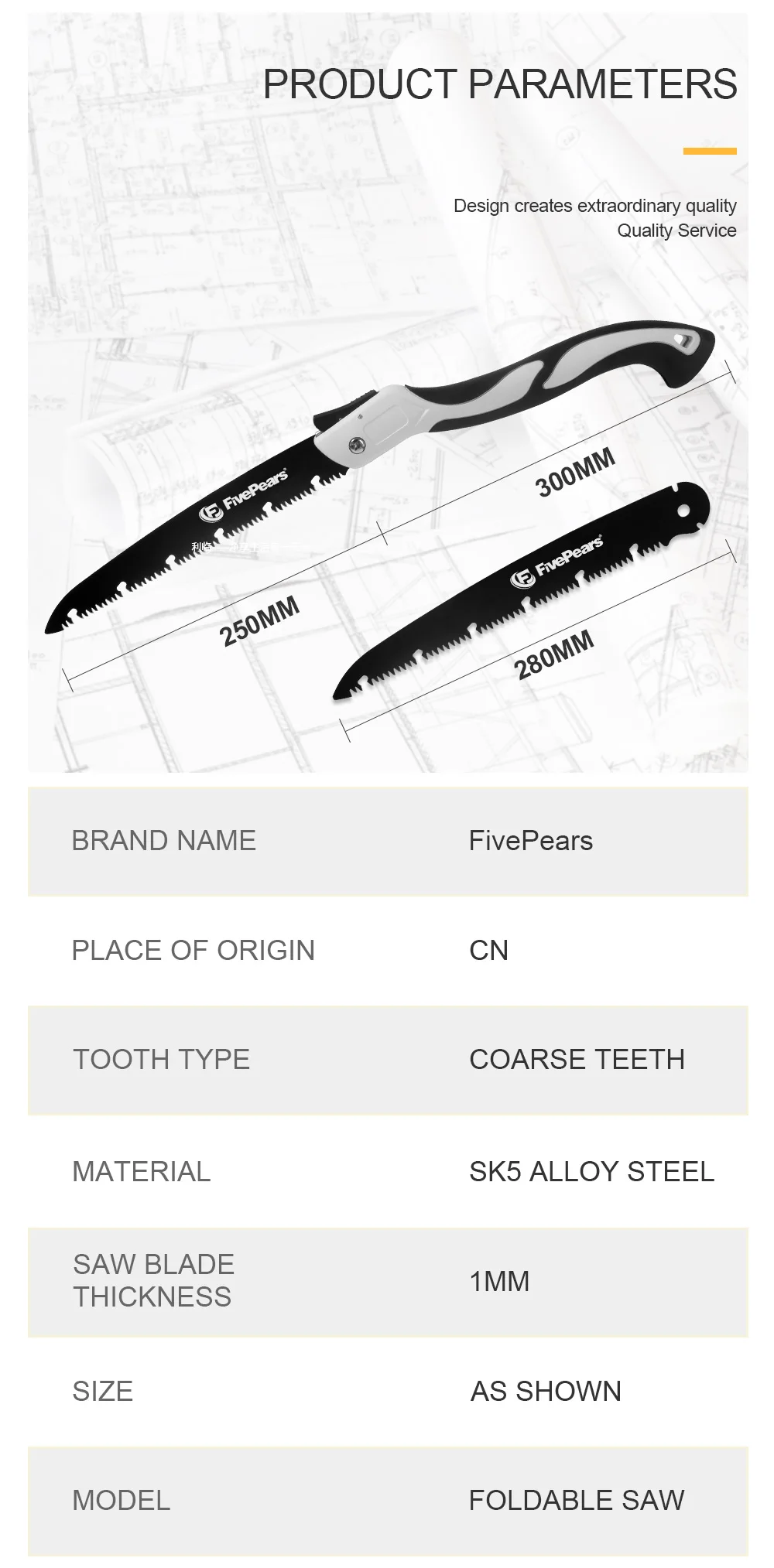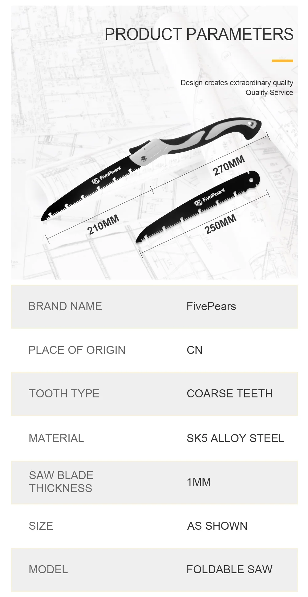 Nous pensons que la scie à main pliante FivePears est un outil de qualité grâce à sa lame en acier allié SK5 avec revêtement téflon. Sa conception de meulage à trois côtés et sa poignée antidérapante en font une scie pratique et facile à utiliser. Nous recommandons ce produit pour les amateurs de bricolage et les professionnels.