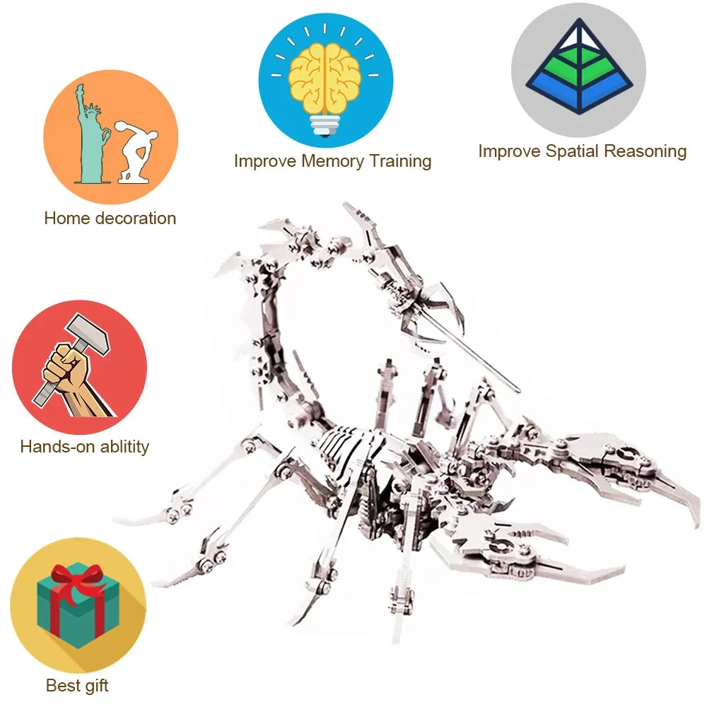 Le Kit modèle métallique 3D Scorpion Mech Fighter est un puzzle 3D conçu pour défier vos compétences de raisonnement spatial. Ce n’est pas votre puzzle plat ordinaire, mais un kit de bricolage en métal qui garantit des détails précis et complexes grâce à sa conception découpée au laser.