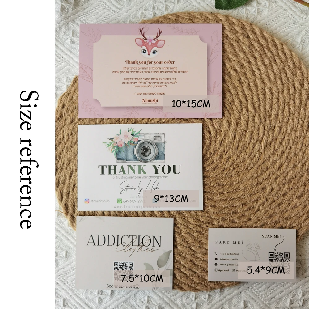 Vous pouvez choisir la quantité et la taille des cartes de remerciement personnalisées en fonction de vos besoins. Si vous ne trouvez pas la taille souhaitée, vous pouvez contacter le service client pour une taille sur mesure.
