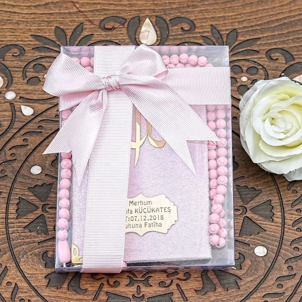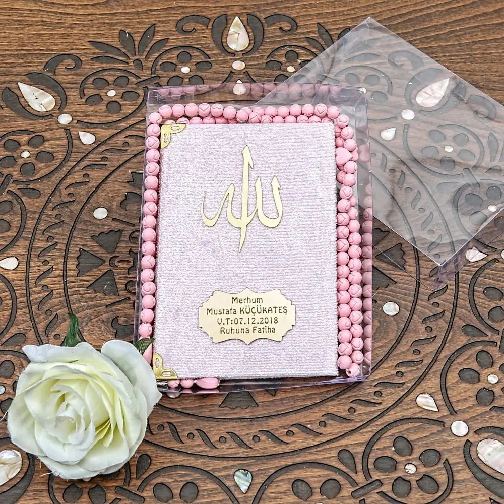 - Livre Yasin recouvert de velours (taille de sac), chapelet parfumé, boîte en acétate (17 × 15)