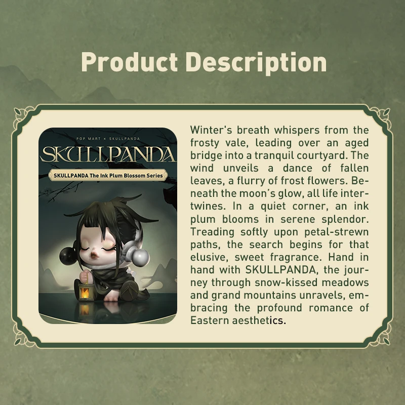 Le souffle de l’hiver chuchote de la vallée glaciale, menant sur un pont âgé dans une cour tranquille. Le vent dévoile une danse de feuilles tombées, une rafale de fleurs gelées. Sous la lueur de la lune, toute la vie s’entrecroise. Dans un coin tranquille, une prune d’encre fleurit dans une splendeur sereine. Marchant doucement sur les chemins parsemés de pétales, la recherche commence pour ce parfum insaisissable et doux. Main dans la main avec SKULLPANDA, le voyage à travers les prairies enneigées et les grandes montagnes se déroule, embrassant le romantisme profond de l’esthétique orientale.