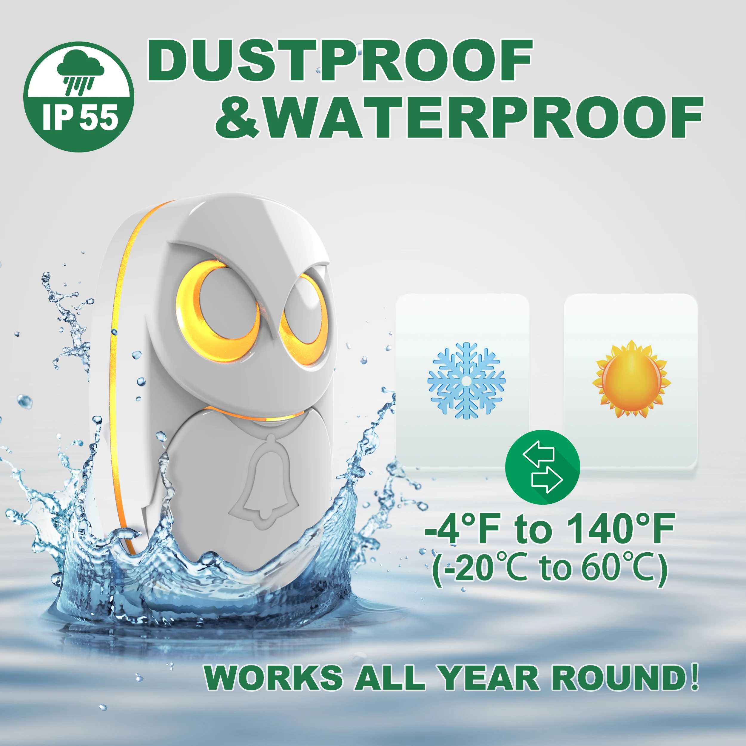 Grâce à la technologie de transmission sans fil FSK + FHSS, cette sonnette offre une portée sans fil allant jusqu’à 1000 pieds (300 mètres). La portée peut varier en fonction du terrain local, mais elle est optimisée pour passer à travers les portes, les murs, les sols, etc.