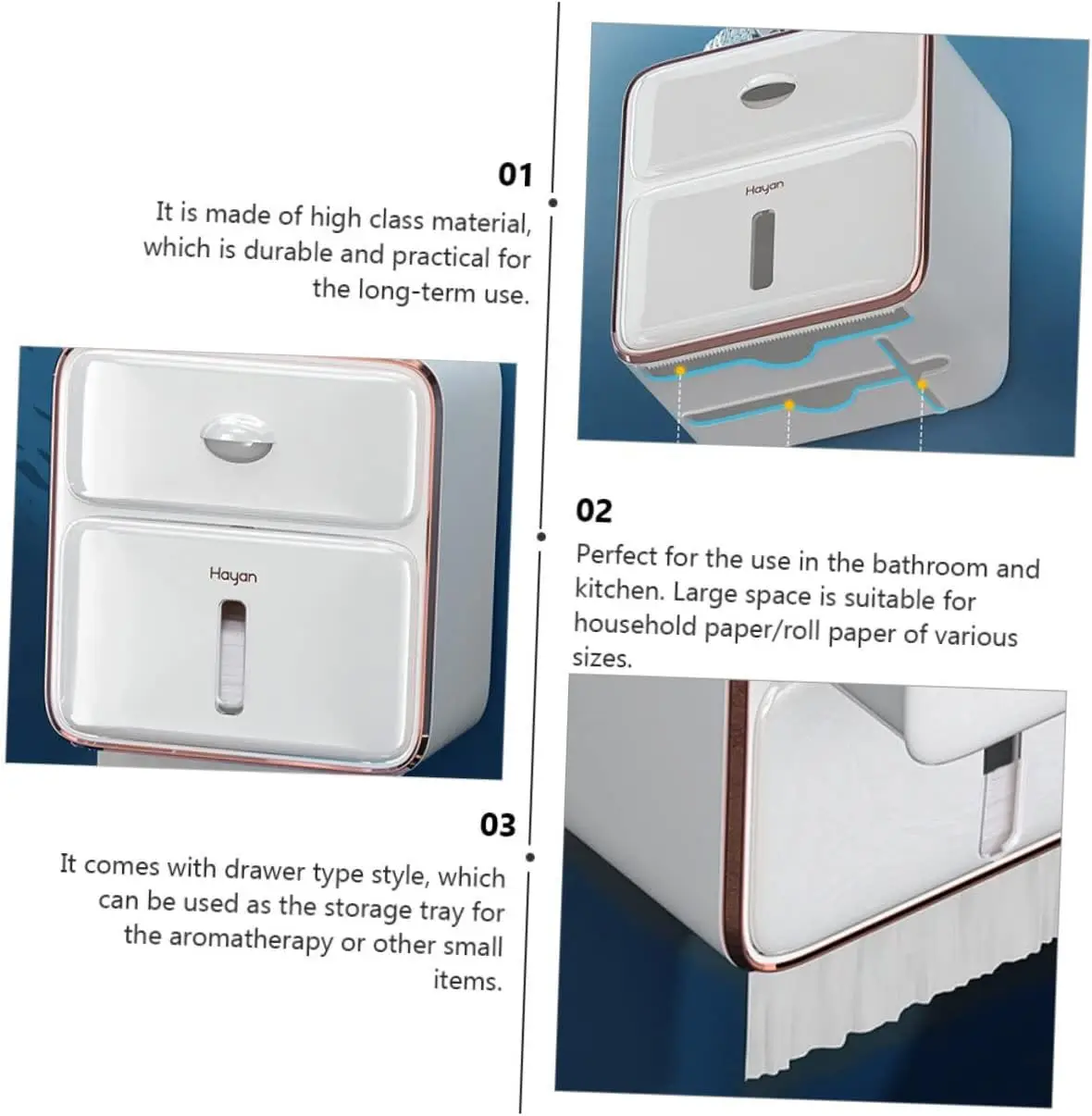 Le produit semble être une bonne solution de rangement pour les mouchoirs en papier. Sa conception durable en matériau ABS assure une utilisation à long terme. De plus, sa taille compacte et son style de tiroir en font un choix pratique pour économiser de l’espace. J’apprécie également la possibilité de le fixer au mur, ce qui optimise l’utilisation de l’espace vertical. Cependant, il est dommage qu’il n’y ait pas encore d’avis clients disponibles pour obtenir un retour d’expérience plus concret. Dans l’ensemble, je pense que ce produit peut être une bonne option pour ceux qui recherchent un moyen pratique de stocker leurs mouchoirs en papier.