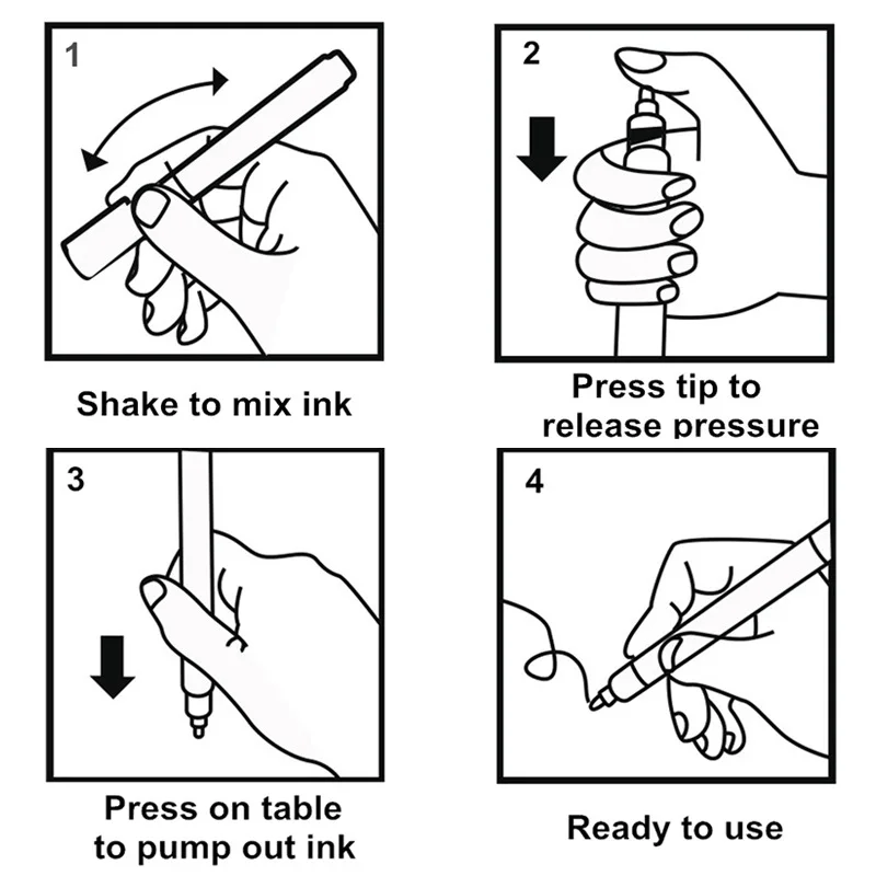 - Appuyez plusieurs fois sur la tête du stylo, ou appuyez légèrement et maintenez jusqu’à ce que l’encre s’écoule avant utilisation. Veillez à utiliser l’encre avant d’appuyer à nouveau pour éviter les fuites d’encre excessives;
