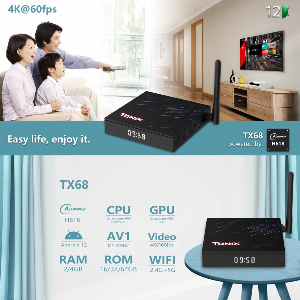 Le Tanix TX68 est équipé du dernier système d’exploitation Android 12.0. Profitez d’une navigation fluide, d’une installation facile des applications et de nombreuses fonctionnalités avancées.