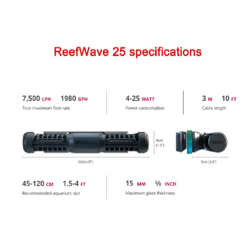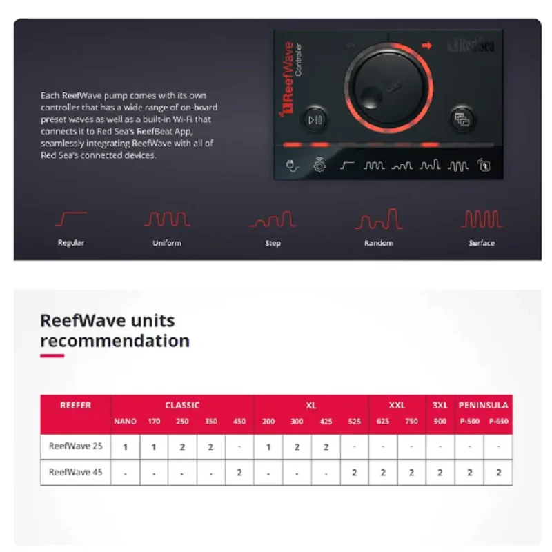 La pompe Red Sea ReefWave 25/45 Programme WiFi Wave Maker est une pompe à vagues intelligente et puissante, spécialement conçue pour les aquariums marins et coralliens. Basée sur la technologie Gyre brevetée, cette pompe offre un débit d’eau optimal REEF-SPEC pour les coraux, quel que soit leur emplacement dans l’aquarium. Son entraînement moteur à onde sinusoïdale avancé, fluide et économe en énergie, ainsi que ses supports d’amortissement des vibrations et ses roulements doubles, en font une pompe quasiment silencieuse.