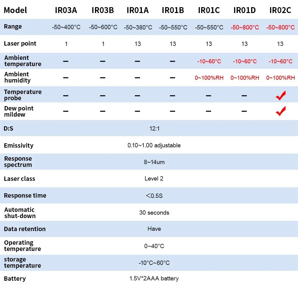 - IR02C : Plage de mesure de -50°C à 800°C avec sonde de température, prise en compte de l’humidité de la température ambiante et moisissure du point de rosée
