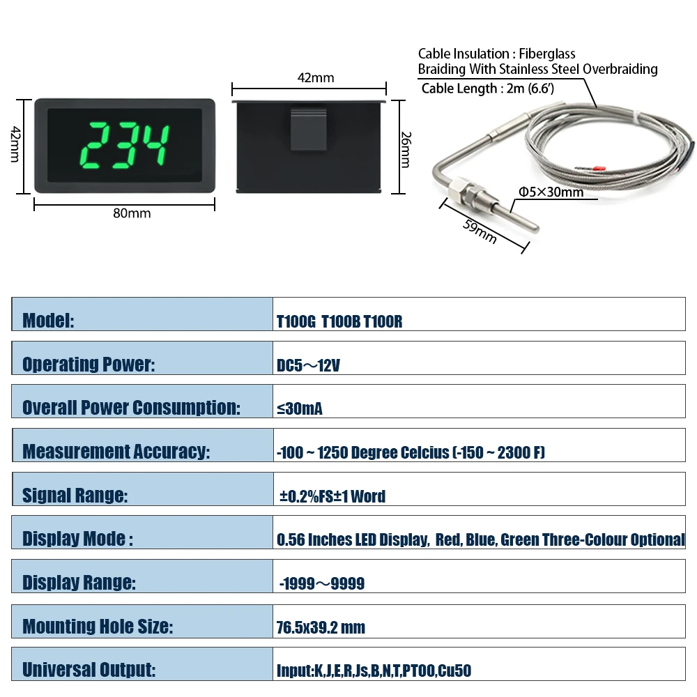 • Plage de température: -100 ~ 1250 degrés Celcius (-150 ~ 2300 F)