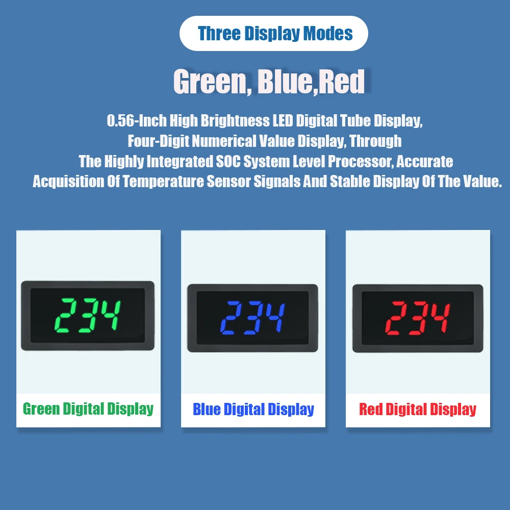 • Mode d’affichage: affichage LED de 0.56 pouces, rouge, bleu, vert tricolore en option